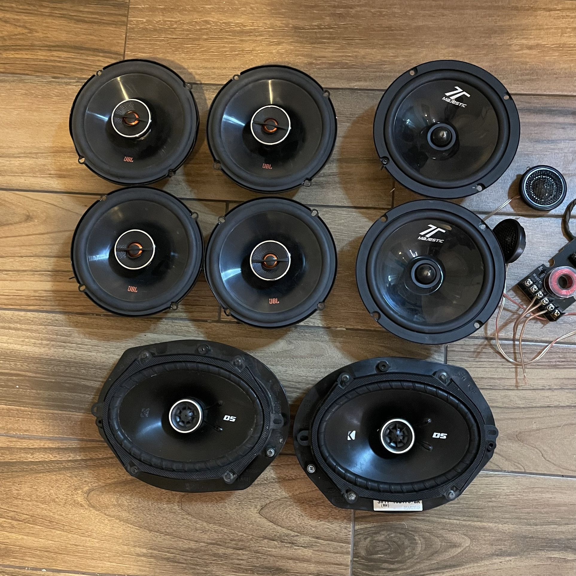 Selling these stereo speakers for car. I have two pairs of JBL 6 1/2, one pair of kicker 6x8 (one speaker doesnโt work) comes with ford speaker adapters not sure what model. And one pair of majestic 6 1/2 comes with tweeters and one crossover. Each pair asking $30. Kicker 6x8 $20 because one is non functional.