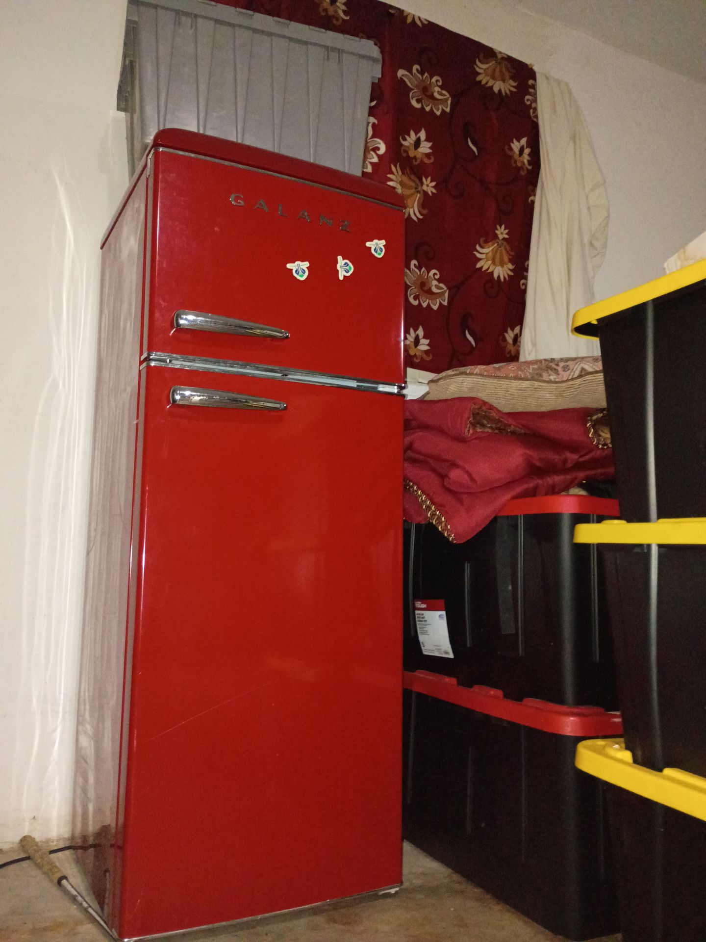 This is a fire engine red antique refrigerator .