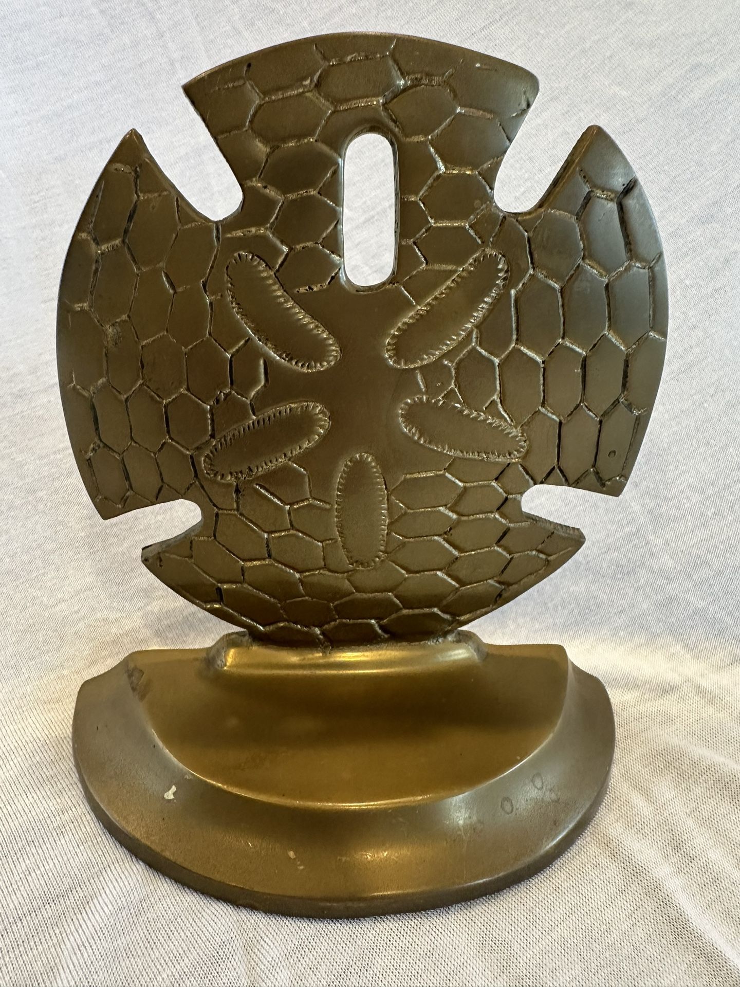 Vintage Brass Bookend (Single) / Letter Holder – Mid Century Style Beautiful vintage brass piece that works great as a single bookend or letter/mail holder. Textured hammered brass finish with a fun coastal sand dollar / coral-style cutout design. Perfect for styling shelves, desks, or entry tables. Details: • Material: brass / brass-tone metal • Use: bookend, letter holder, mail sorter, desk organizer • Approx. 6–7” tall (see tape photo) Condition: Good vintage condition with natural patina and age wear (adds character). Sturdy and functional.