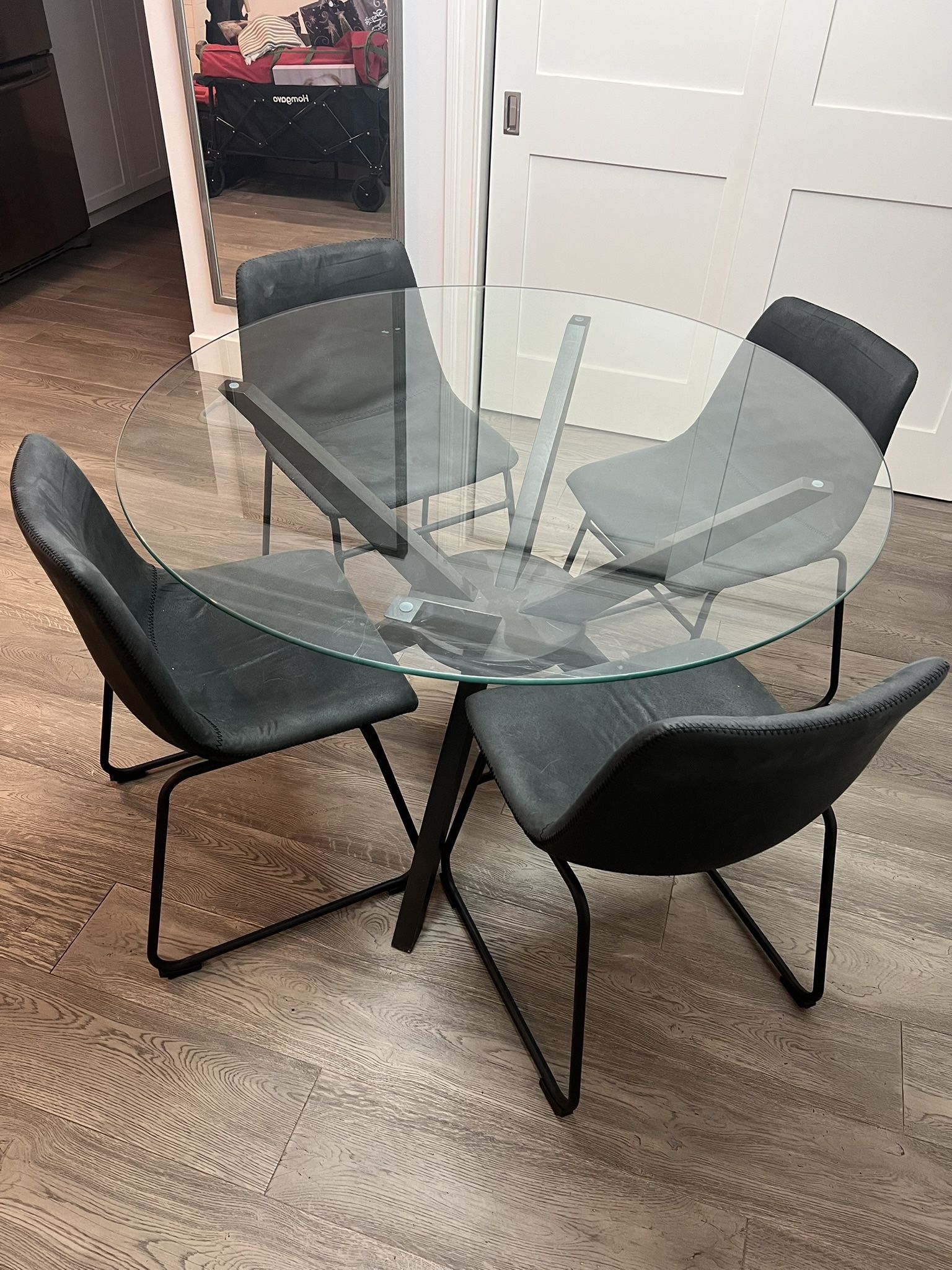 48” round glass with modern black wooden base. Include 4 black chairs. Pickup in Eastchester, NY.