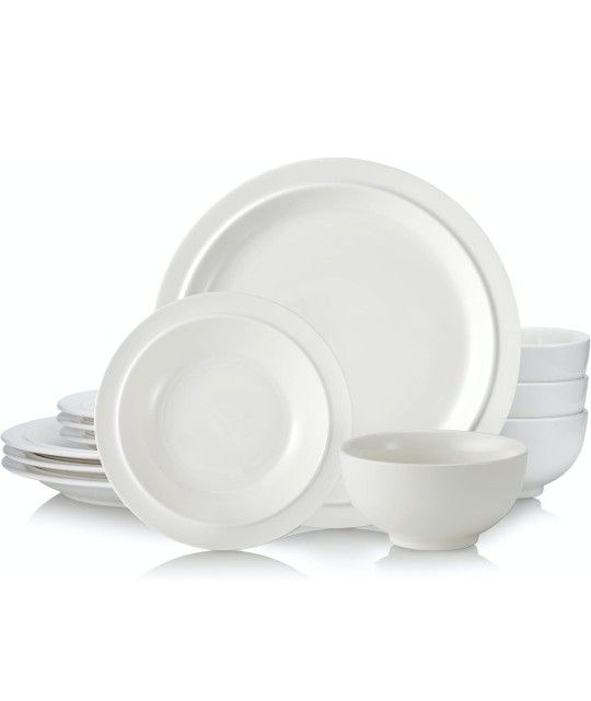 New, 12-Piece Porcelain Chip and Scratch Resistant Round Dinnerware Set, Plates, Dishes, Bowls, Service for 4 (White)