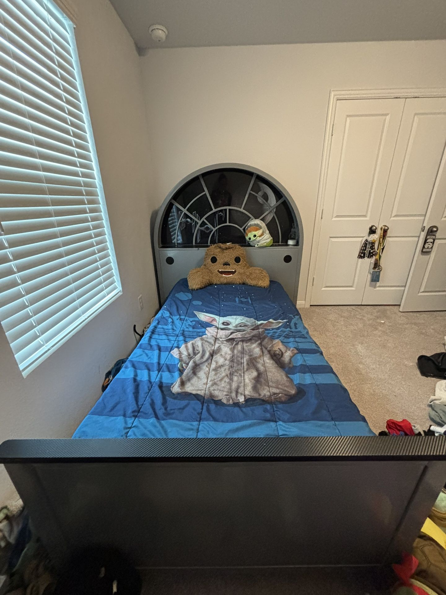 Twin Star Wars bed frame that was sold by Kids Rooms To Go. Very great condition and the head board has speakers that will play music and if connected to phone. It also lights up. My son has outgrown his Star Wars phase so he’s ready to part with it. It’s only the bed frame (no mattress) and if interested for extra we can include the Chewbacca pillow, Star Wars stuffies, and bed set for extra. The head board is very heavy so it’ll definitely need to be put into a truck and will need help loading. We hate to see it go but it’ll be a great bed for another Star Wars lover that’ll appreciate it!