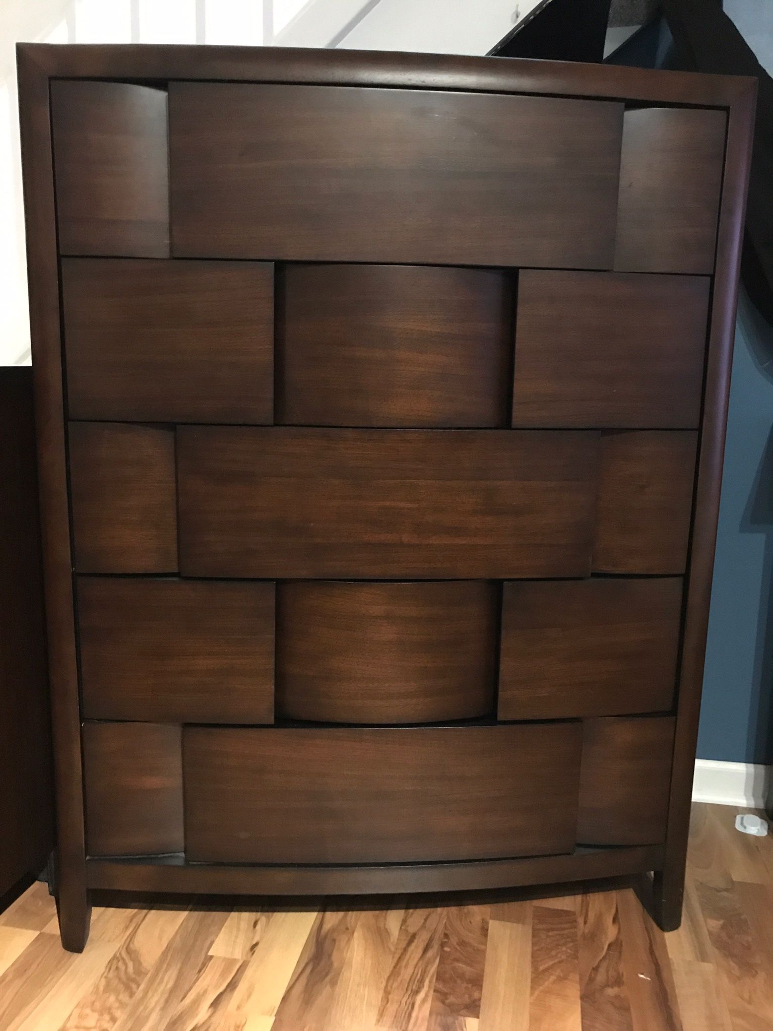 Magnussen Home Furniture 5 drawer dresser- perfect condition! Dimensions: 50” tall, 38” wide, 15” deep Price is for single dresser, but I have a second one available as well. I also have the entire 5 piece set available and am willing to offer discounts if you purchase multiple pieces. Check out my page to see the other pieces and my other items! Moving sale!