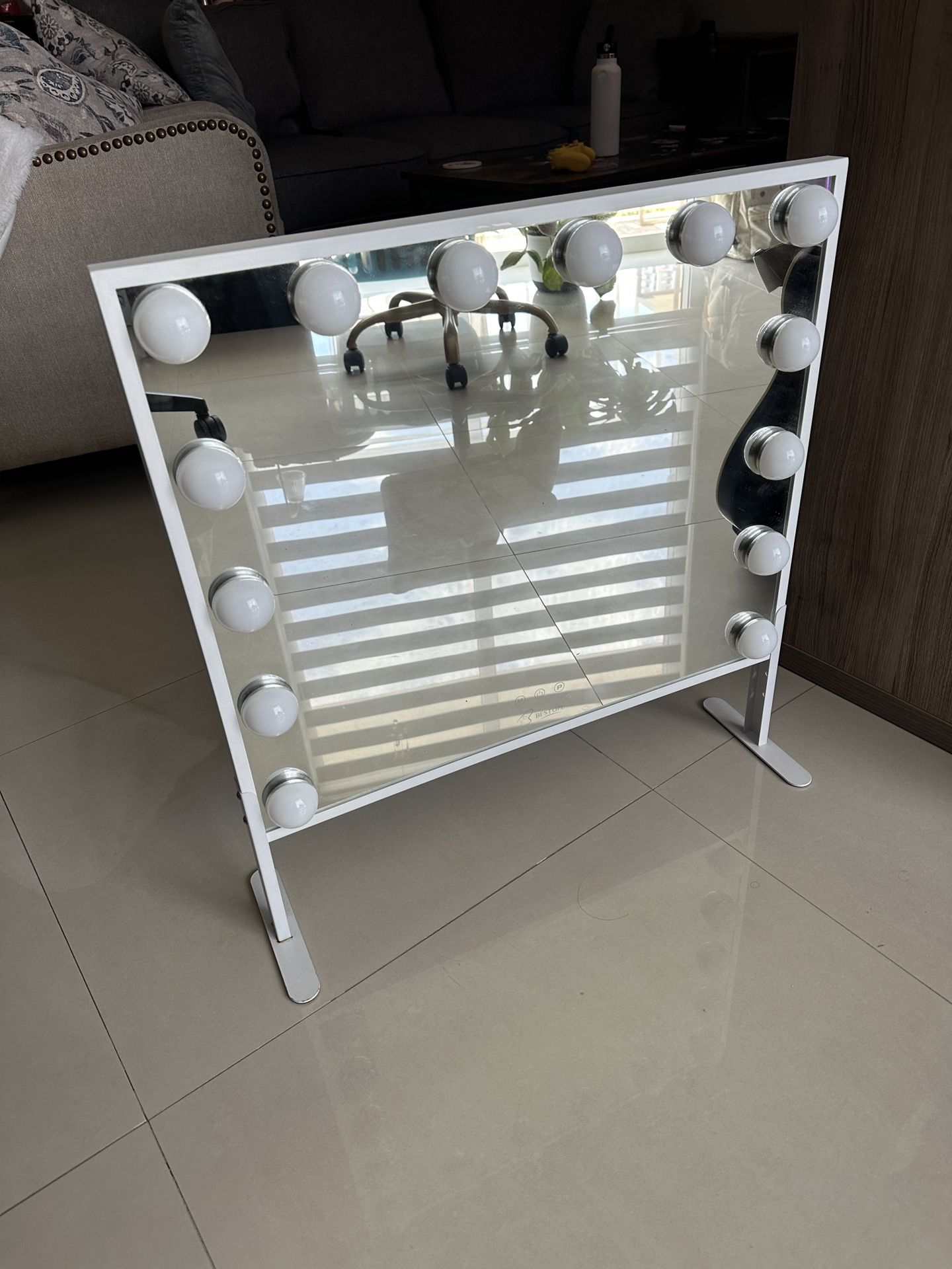 Vanity mirror with lights that have multiple color and brightness settings. All lights work and the mirror has no scratches. Stand legs can be removed if you wish to hang the mirror.