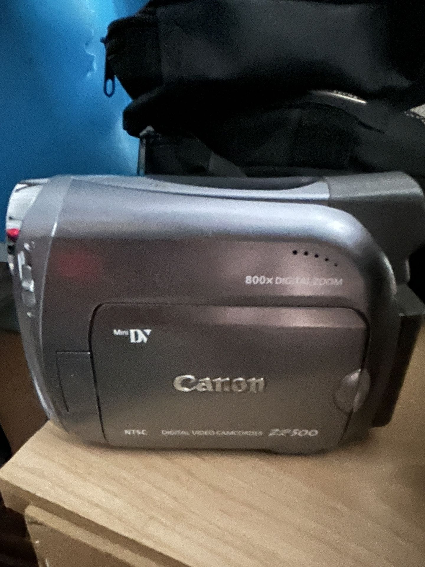 Canon MiniDV digital video camcorder with 800x digital zoom. Ideal for converting old MiniDV tapes to digital or for retro video use. Details: • Canon MiniDV tape camcorder • NTSC format • 800× digital zoom • Compact handheld design Condition: Good used condition with normal cosmetic wear consistent with age. Powers on. Tape playback not fully tested. See photos for details. Includes: • Camcorder • Carrying case • Power/AV cords (as shown) Price: $90 OBO