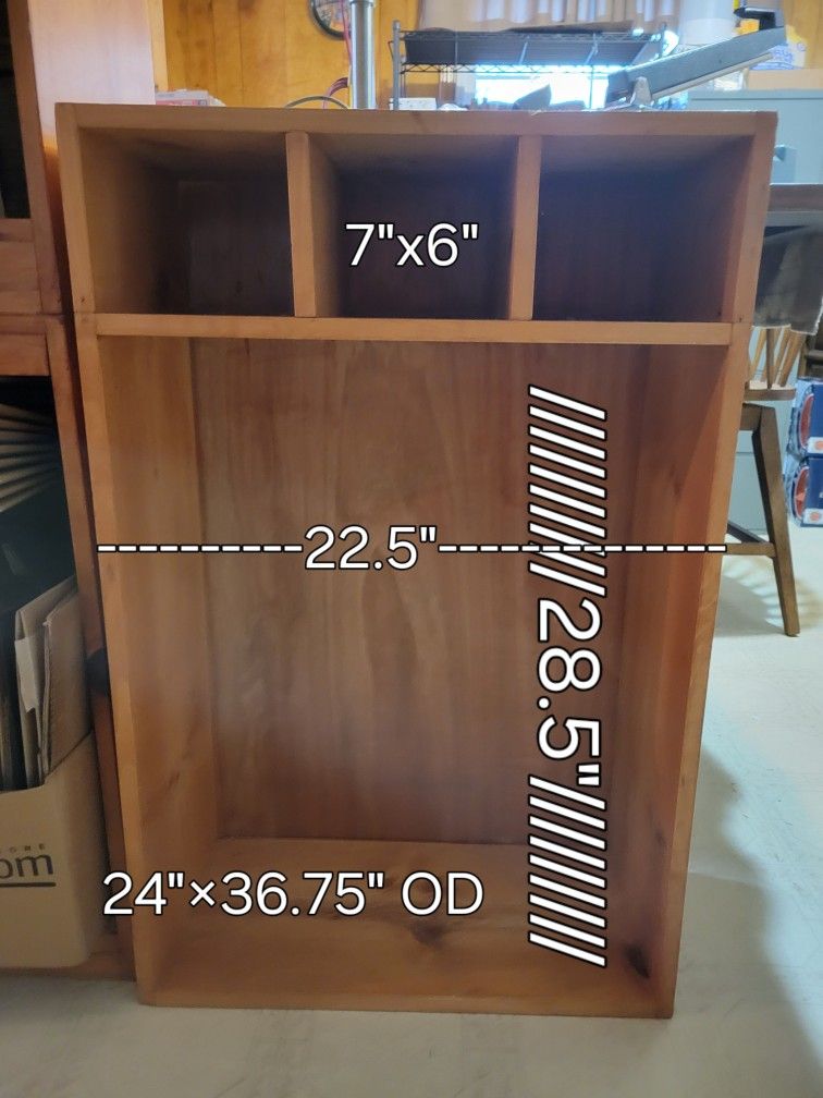 This is a solid wood cabinet with 3 cubbies. Measurements are shown on the 1st picture. It is 11.5" deep. Please message with any questions!