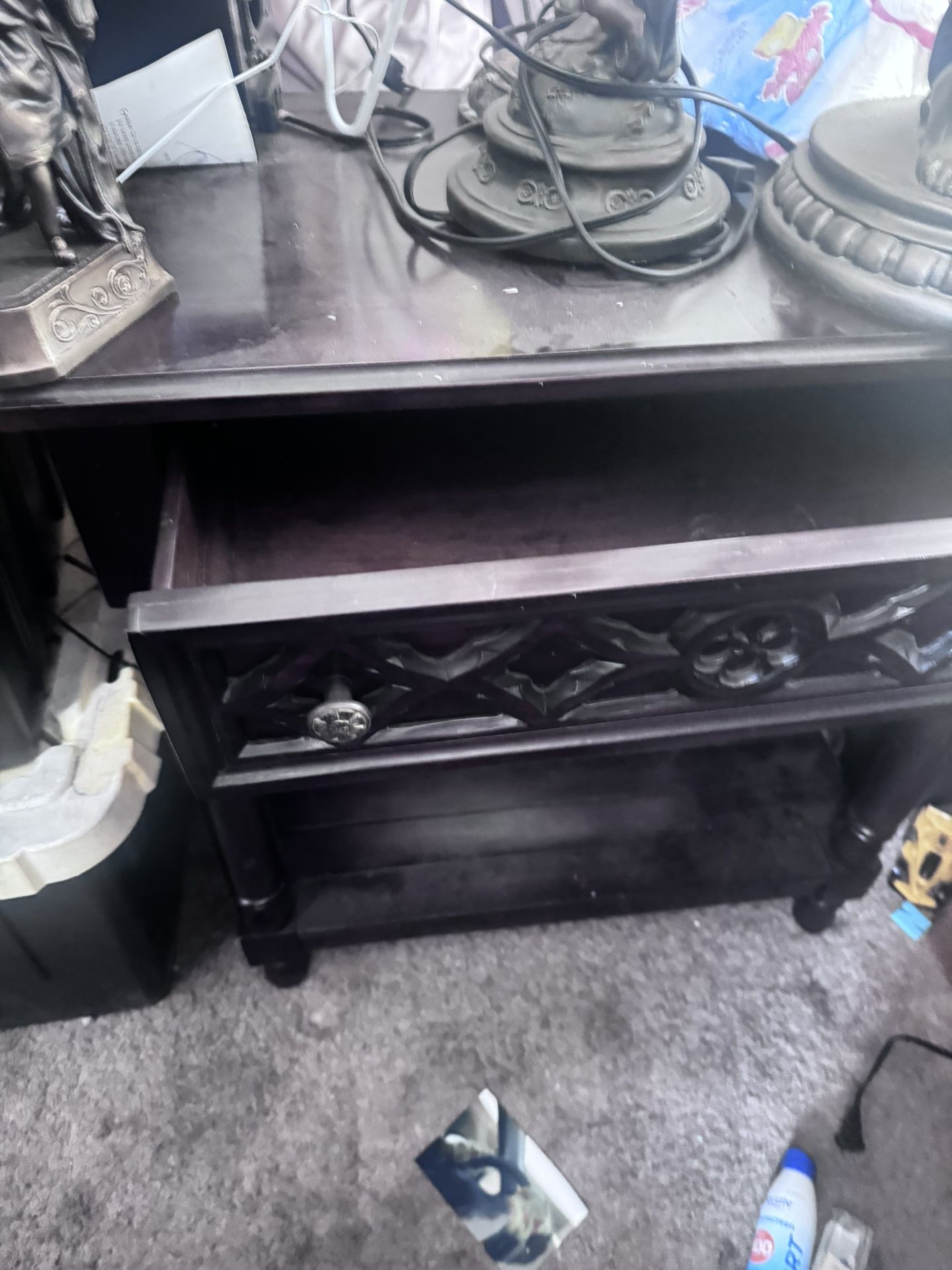 This is a dark wood end table or nightstand with gothic quatrefoil carved detailing.