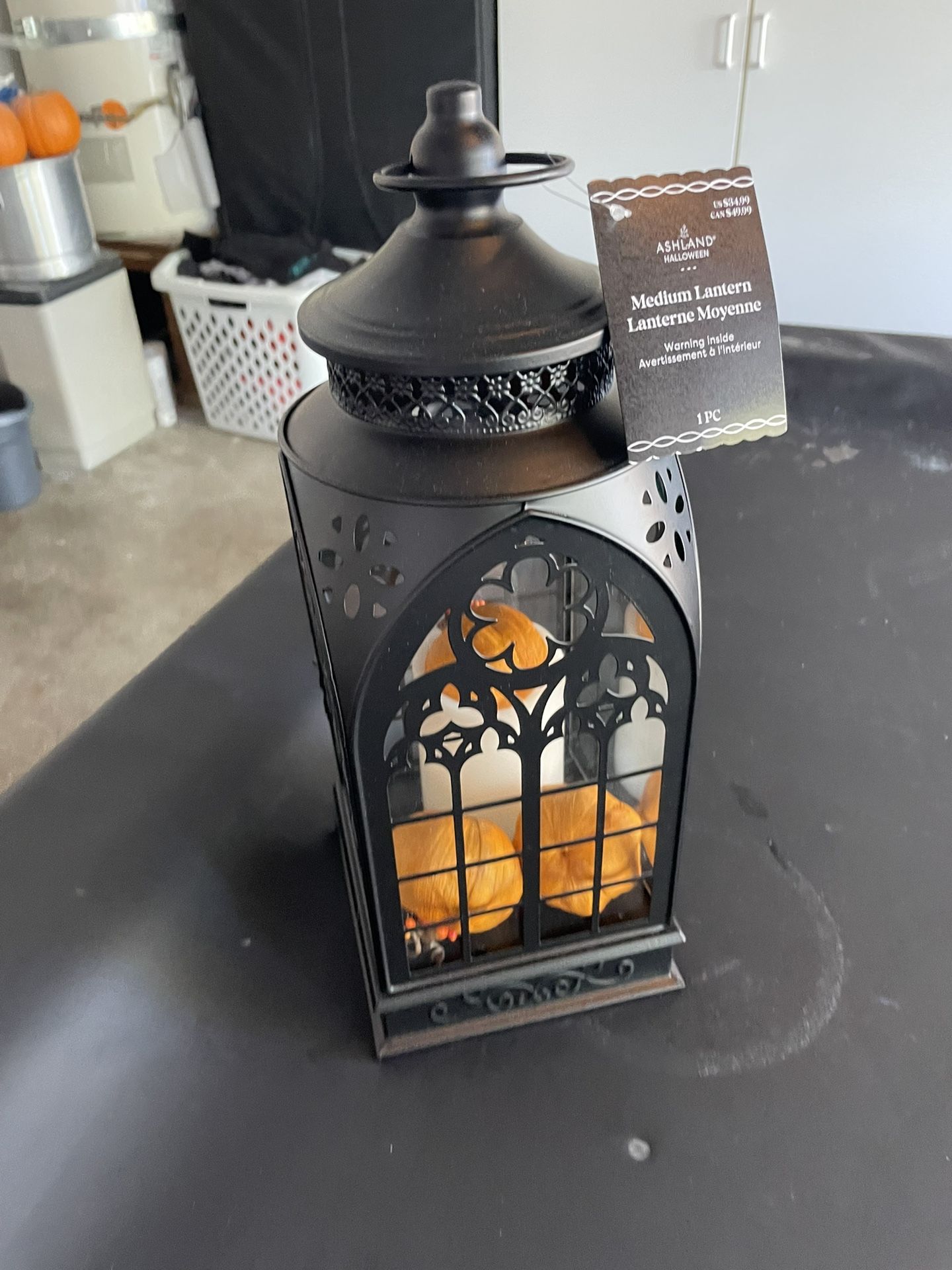 New lantern with tags. Has candle and three little decorative pumpkins can be removed to decorate for any holiday