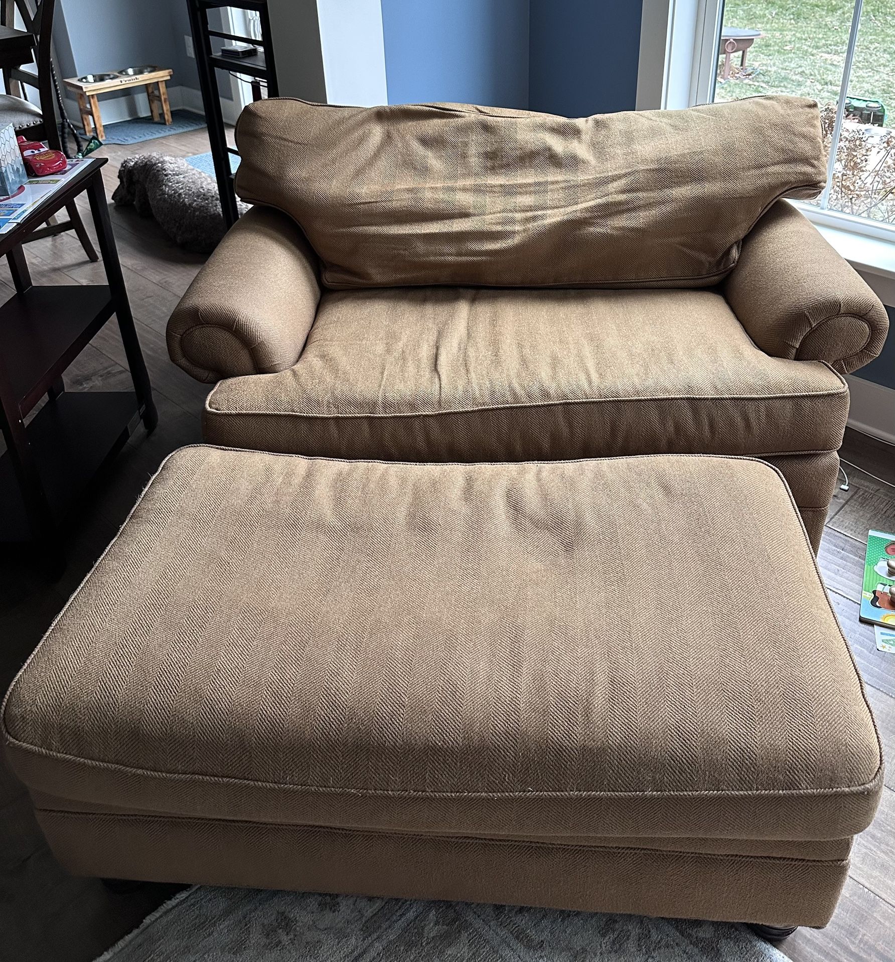 Gently used with no notable damage. Dimensions of couch: 26x33x55 Ottoman: 24x43