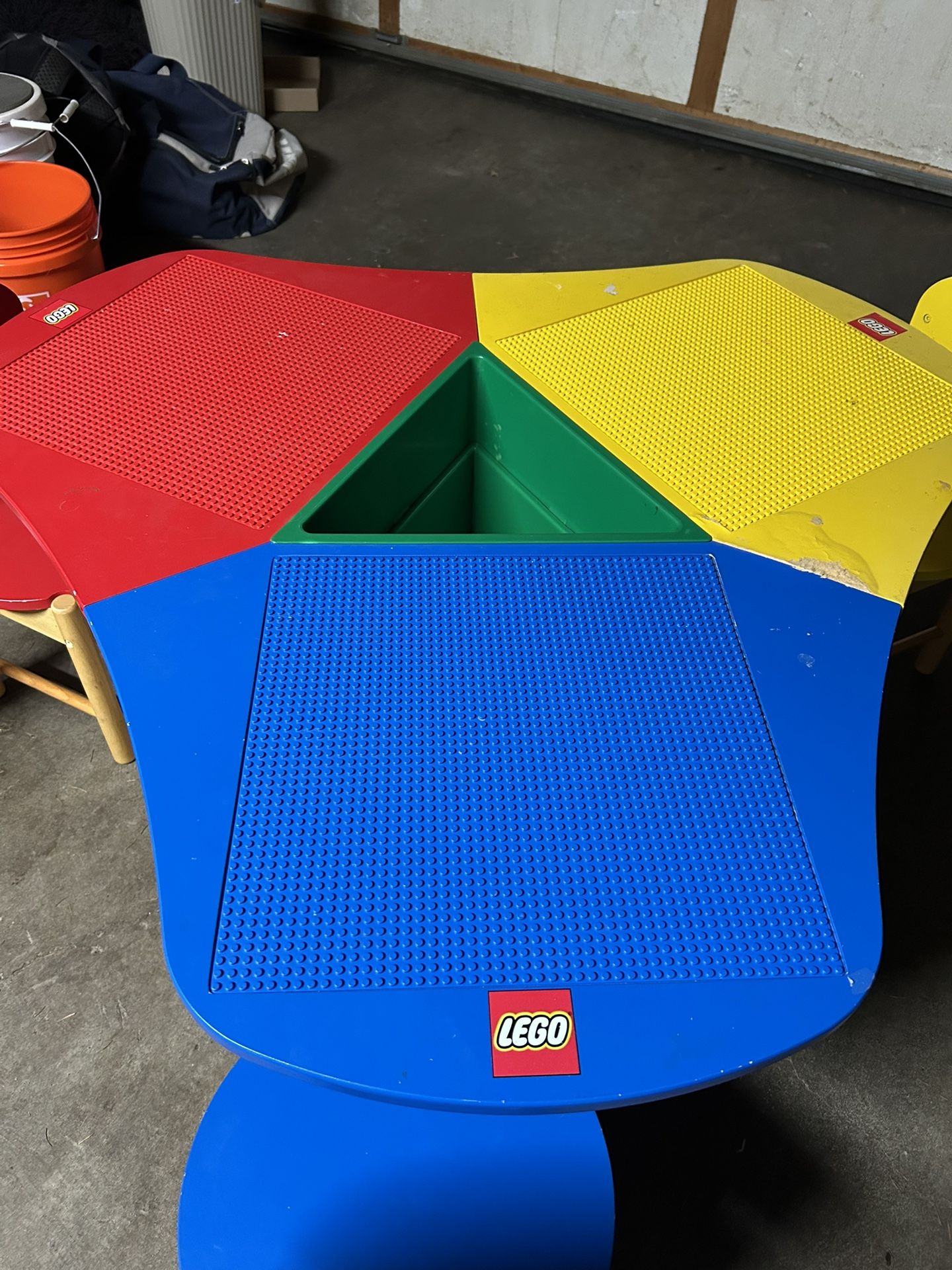 Ideal for kids 3-9. Comes with 3 matching chairs and center bin for legos. Looking for a good home that will get use.