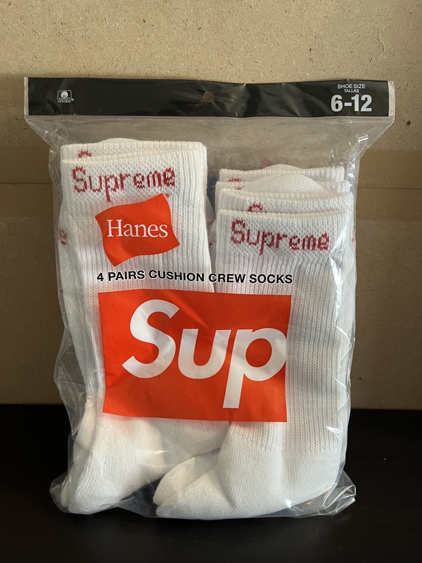 Hi thanks for checking my post, this is a brand new/never been tried on/deadstock cotton blend Supreme x Hanes Cushion Socks White Pack with Supreme jacquard logo at top, there’re 4 pairs of socks in 1 pack and they fit Sz6-12. I also have different color (black/olive) available. NO TRADE. Item is 100% authentic & purchased directly from Supreme, please dm me if you have any question or concern Thanks for your business!