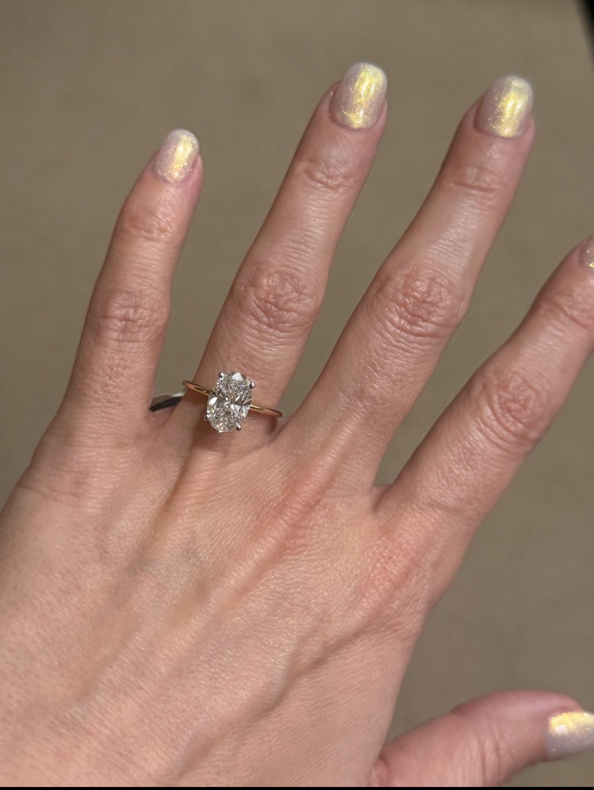Beautiful oval lab-grown diamond ring in 14K gold. Super clean, timeless look that sits nicely on the finger — elegant without being flashy. The center stone is a 2.5 ct oval lab-grown diamond, F color, VS1 clarity, with smaller round lab diamonds along the setting for extra sparkle. Total diamond weight is 2.75 cts. Stones are certified and the certification card is included. This ring is in great condition and looks even better in person. Perfect as an engagement ring or a special gift. Serious inquiries only. Happy to answer questions or send more photos.