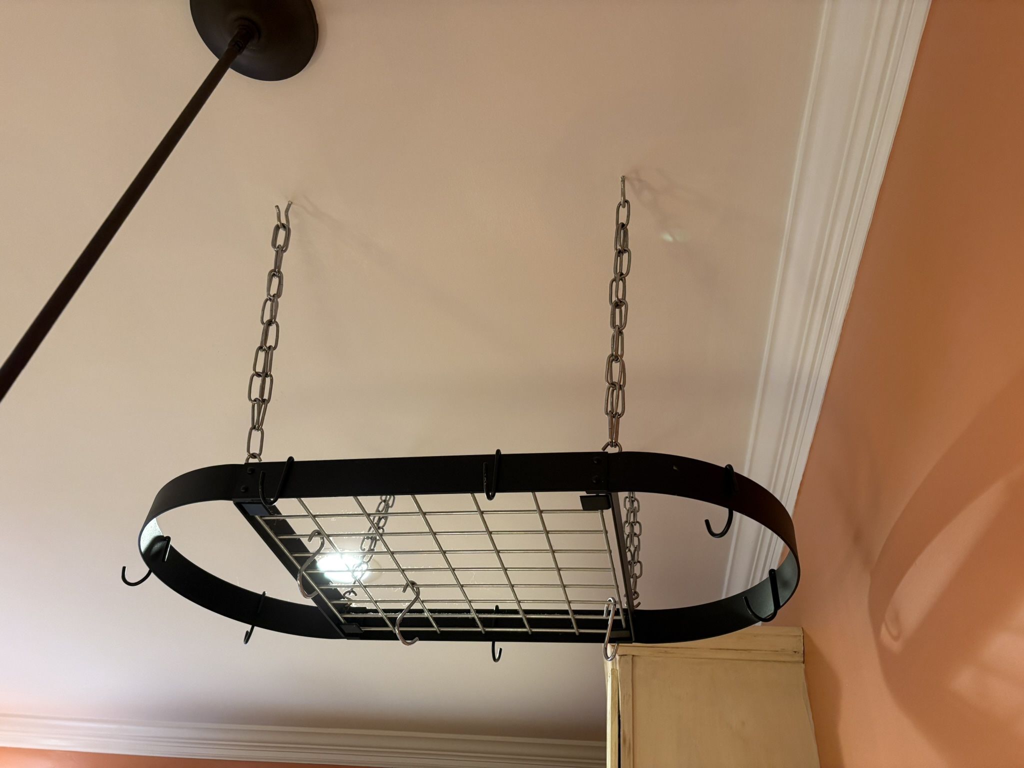 Elevate your kitchen with this high-end rack. Keep all of your frequently used pots and pans within an arms reach as you cook. Great for people who love to cook and entertain. Includes everything pictured: oval frame, chains, ‘S’ hooks and ceiling hooks.