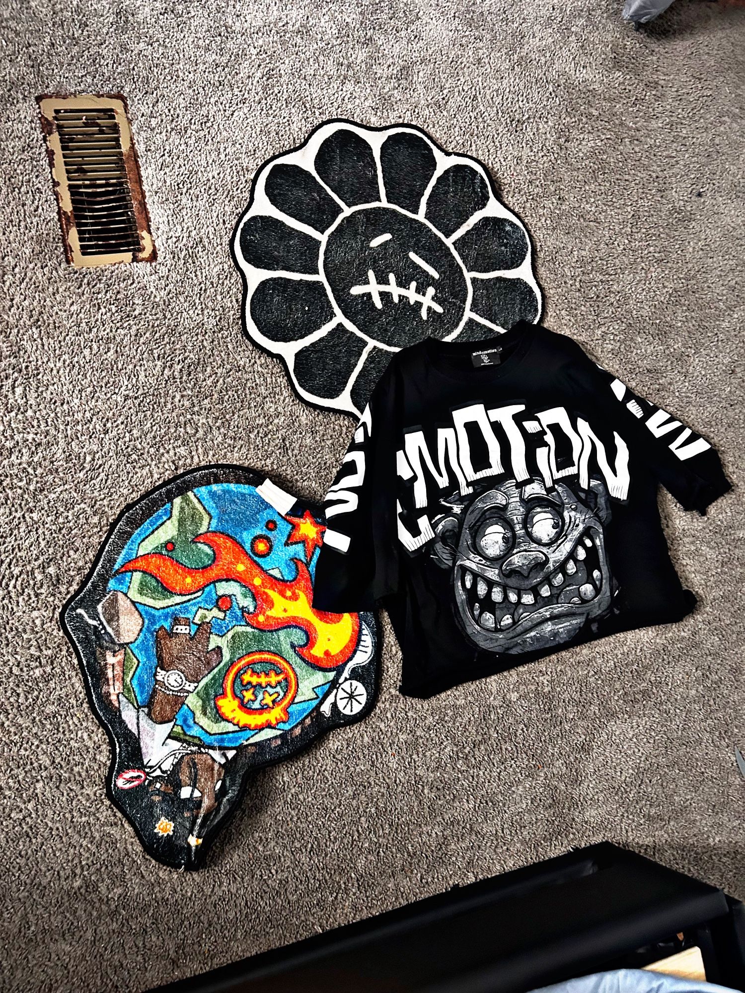 Black graphic hoodie/shirt, clean condition. No rips or stains. Meet up only. (Rug not included) Cash App or cash only.