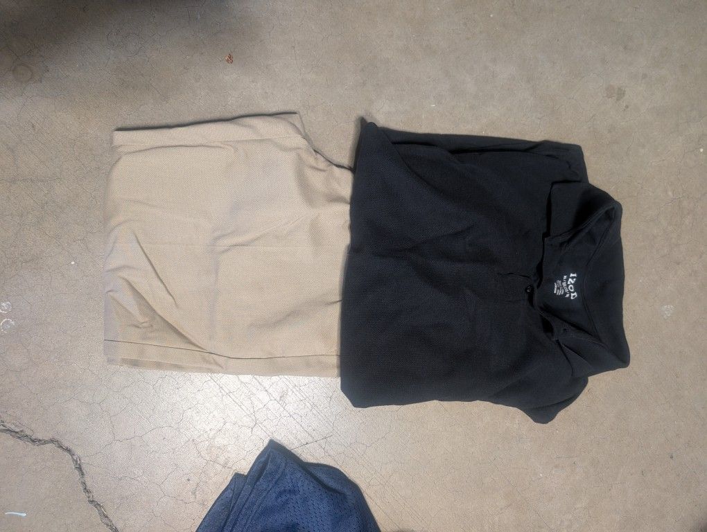 Men's 29x32 Old Navy khaki pants and youth 18/20 button polo shirt.