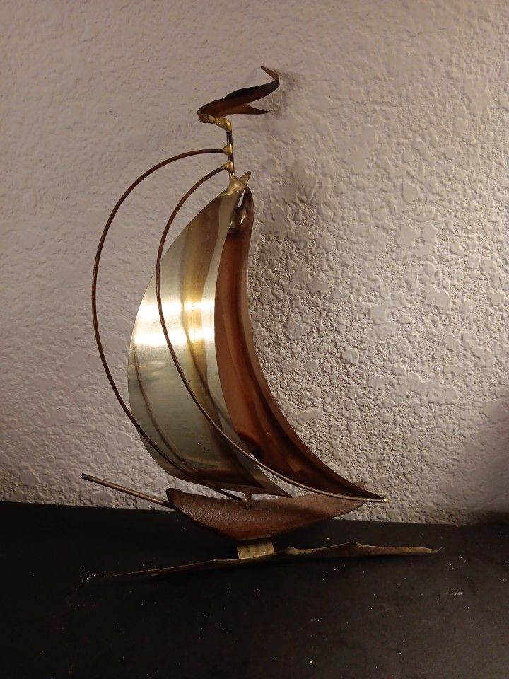 GORGEOUS Curtis Jere Style Brass & Copper 9" Sail Ship 3D Model Figurine. This stunning 3D model figurine of a sail ship features intricate brass and copper detailing, making it an eye-catching addition to any collection of decorative collectibles. The primary material used in the creation of this piece is brass, while copper has also been incorporated for added visual interest. Ideal for collectors of nautical-themed décor, this gorgeous Curtis Jere-style figurine measures 9 inches in height and is sure to make a statement in any space. Whether displayed on a shelf or used as a centerpiece, this sail ship figurine is a must-have for anyone who appreciates quality craftsmanship and unique design. BOX 22