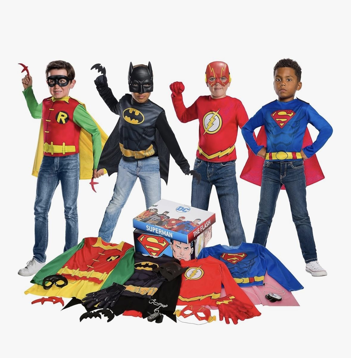 DC Super Hero Costumes. For ages 2-5 year olds. Comes with Batman, Robin, Superman and Flash. All clean and in good shape. On Amazon for $59.99