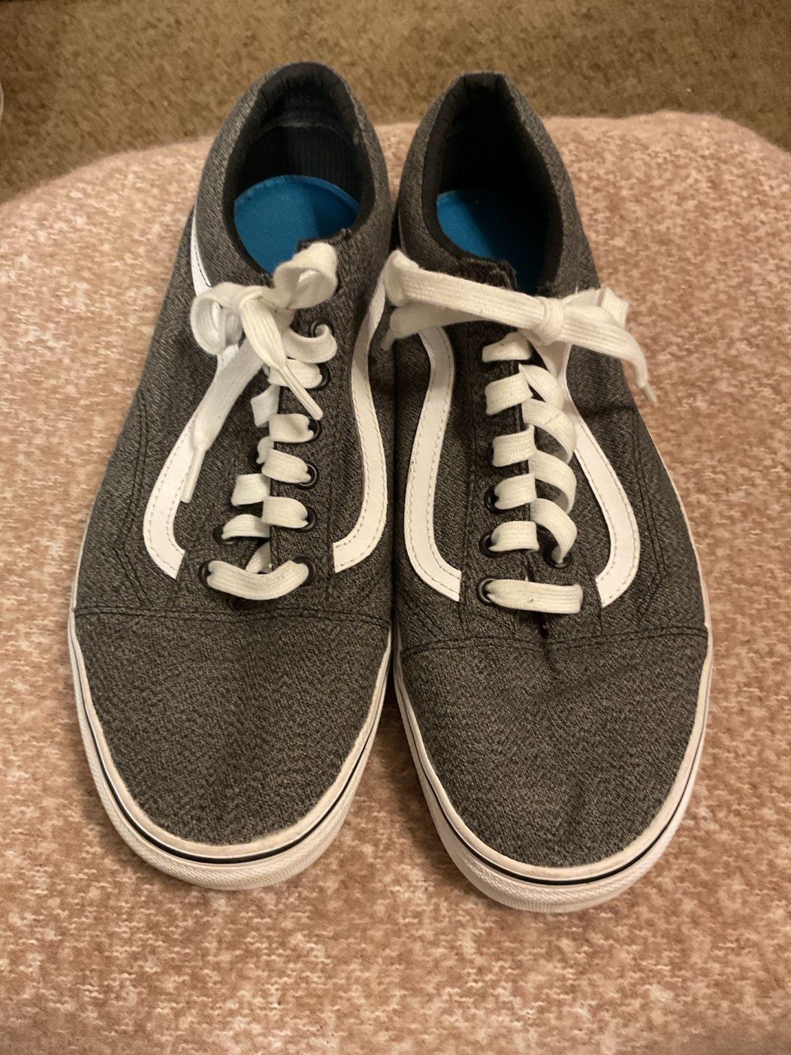 Classic Vans Old Skool sneakers in a versatile heathered charcoal gray with the iconic white side stripe. These low-top lace-up shoes feature a durable canvas/textile upper, cushioned interior, and signature gum waffle rubber outsole for grip and everyday comfort. Perfect for casual wear, skating, streetwear styling, or everyday use. The neutral gray tone pairs easily with jeans, joggers, or shorts. Size Men’s 11.5 (US). Condition Pre-owned, excellent condition. See pictures and ask any questions. Light normal wear from use. Soles show minor wear but plenty of life left. Uppers are clean with no major flaws noted.