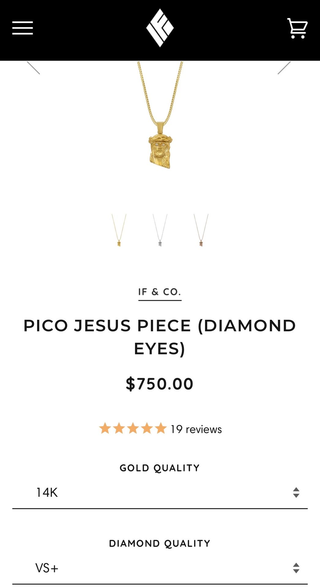 Get this 100% Authentic Jesus Piece by IF&CO. IF&CO. hand makes everything from the highest quality 14k solid gold and VS diamonds. Save money and get it here. For you or your lady. It's perfect! Comes with - Franco chain 1.5 mm 20" | 14k solid gold - PICO JESUS PIECE (DIAMOND EYES) pendant solid 14k gold with VS diamond eyes - box and velvet bag. The box lights up when you open it to show the chain and pendant inside. Website description. Also known as the 'Super Nano' Jesus Piece, our smallest Jesus Piece is now available. Once you own one, you'll discover why our trademark Jesus Piece pendant has been a classic joint desired by those all around the world for years. An original design by IF & Co. This Jesus Piece is made of gold, and handmade as always. Hand detailed and hand set with round diamonds. A matching chain is included. Diamonds on the eyes only. Total height approximately 0.7" tall with the bale included. Pico sized. https://offerup.com/redirect/?o=aHR0cHM6Ly93d3cuaWZhbmRjby5jb20vY29sbGVjdGlvbnMvamVzdXMtcGllY2VzL3Byb2R1Y3RzL3BpY28tamVzdXMtcGllY2UtZGlhbW9uZC1leWVz