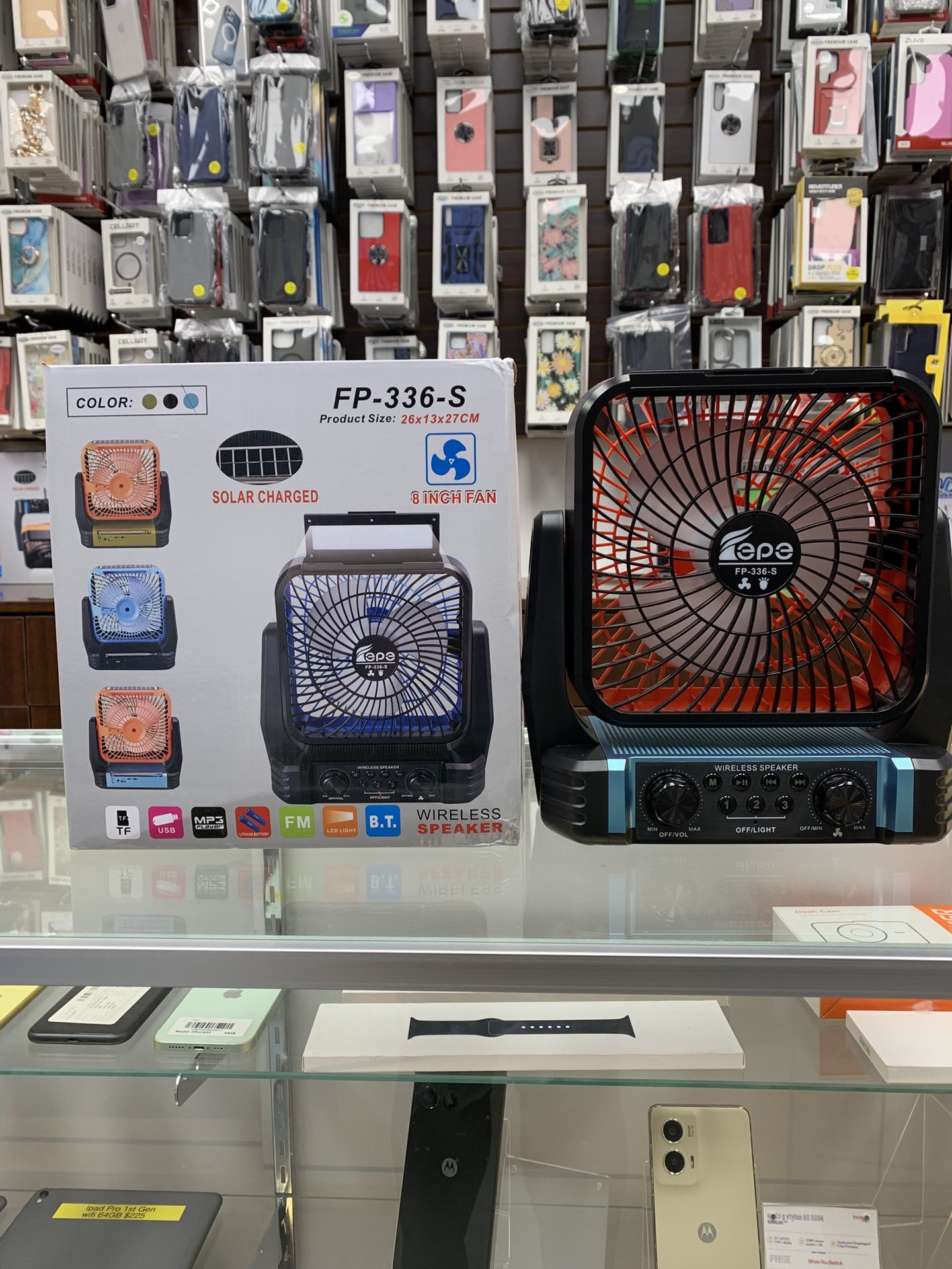 Solar charged fan with wireless Bluetooth and FM speaker It’s 8 inch fan You can use USB drive for music BT FM MP3 player as well