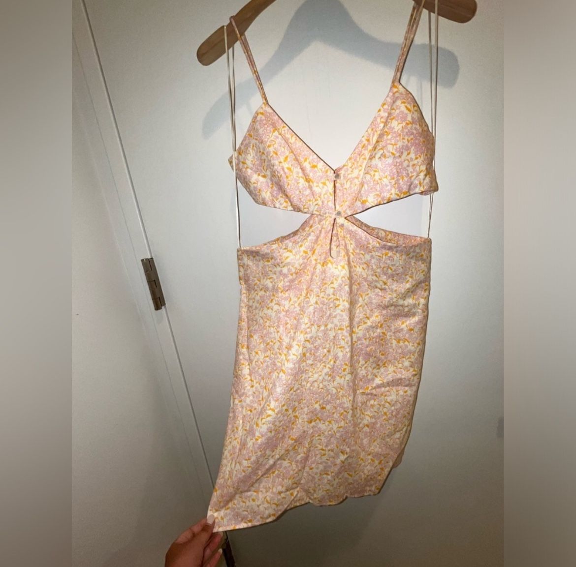 Zara Size large but it fits more like a MEDIUM!!! Its like a s/m Mini dress Cutouts Floral print purple, orange and yellow Perfect for vacation, spring and summer Zipper closure in back The model is not me. That’s my friend. I’m a large Please let me know if you have any questions 🩷