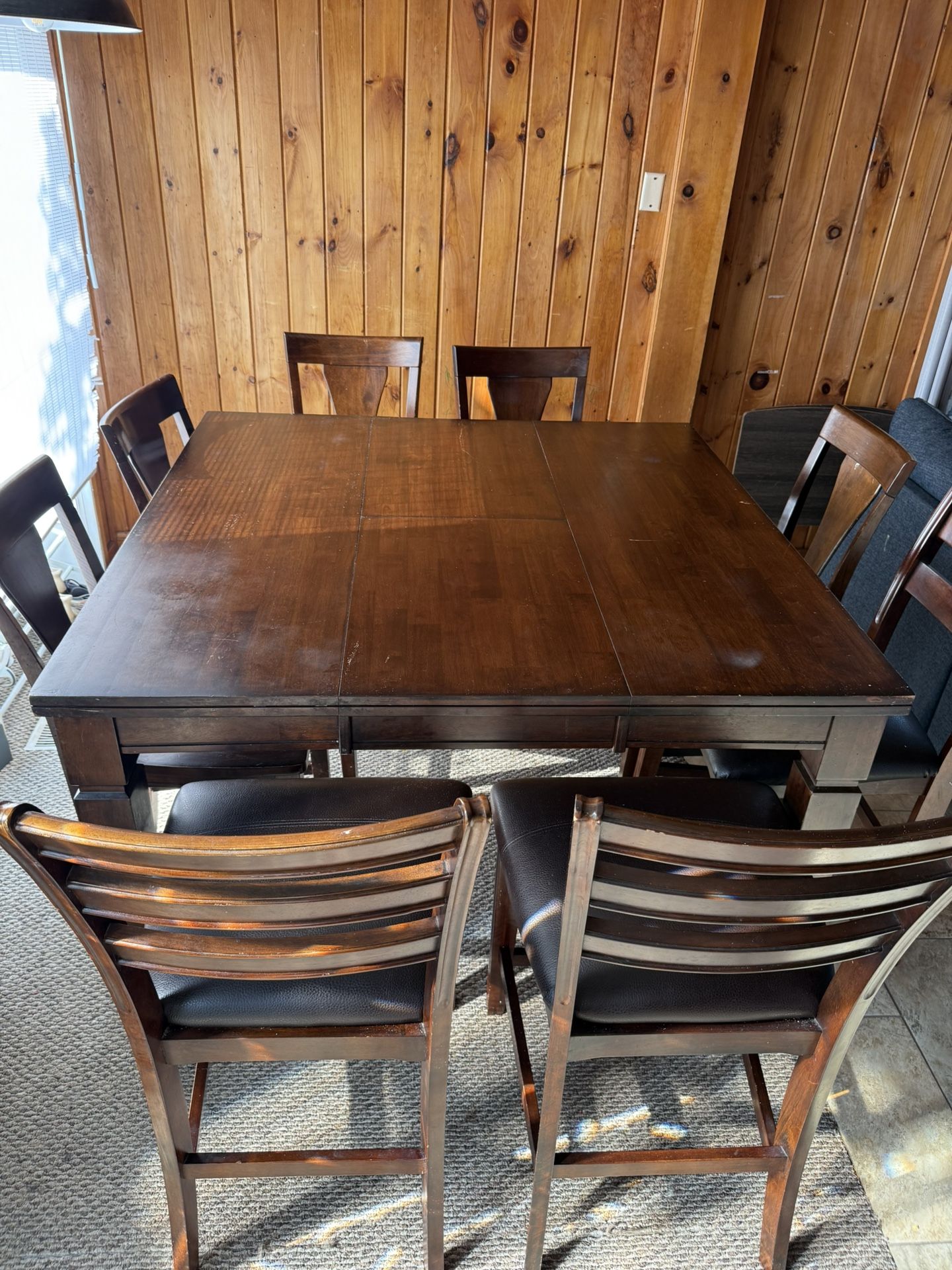 Must pickup! Solid wood dinner table with built in extendable leaf, perfect for family dinners! Comes with 11 chairs. Currently measured closed at 4’5”x4’5”.