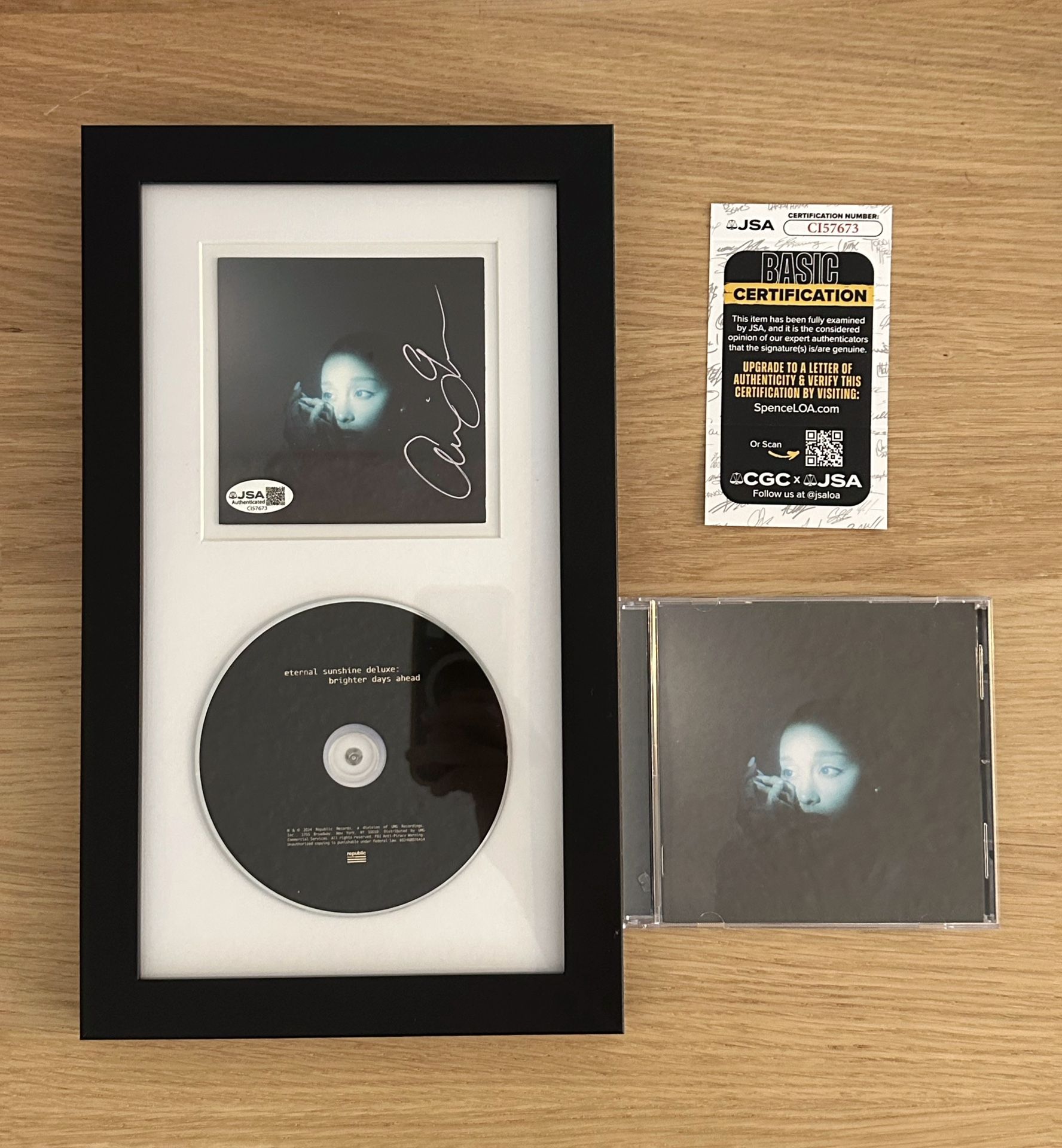 Ariana Grande Eternal Sunshine Deluxe Brighter Days Ahead CD Signed In Pink COA JSA Rare vertical pink marker signature framed. Certified of authenticity by JSA. Certification # C157673 Will ship with care and come with the rest of the cd contents.