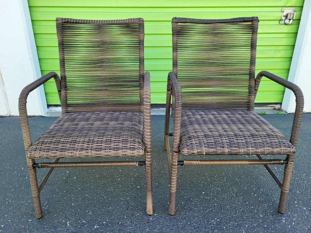 Color: gray/brown Create a comfortable seating spot in your outdoor space with the Granby 2-Pack Padded Wicker Patio Dining Chairs from Threshold. This two-pack of charming wicker patio chairs are made with weather-resistant materials for convenient use outside. Each chair has a thick seat, a high backrest and raised armrests for enhanced comfort while dining, reading or relaxing in your garden, backyard, sunroom or on the deck. In a versatile wicker finish, these outdoor chairs make a great addition to a variety of patio decor schemes, and they pair perfectly with a wicker side table to form a restful refuge for two. Dimensions (Overall): 35.43 Inches (H) x 22.64 Inches (W) x 26.77 Inches (D) Seat Dimensions: 20.59 Inches [W], 18.11 Inches [D], & 17.12 Inches [floor to seat top]