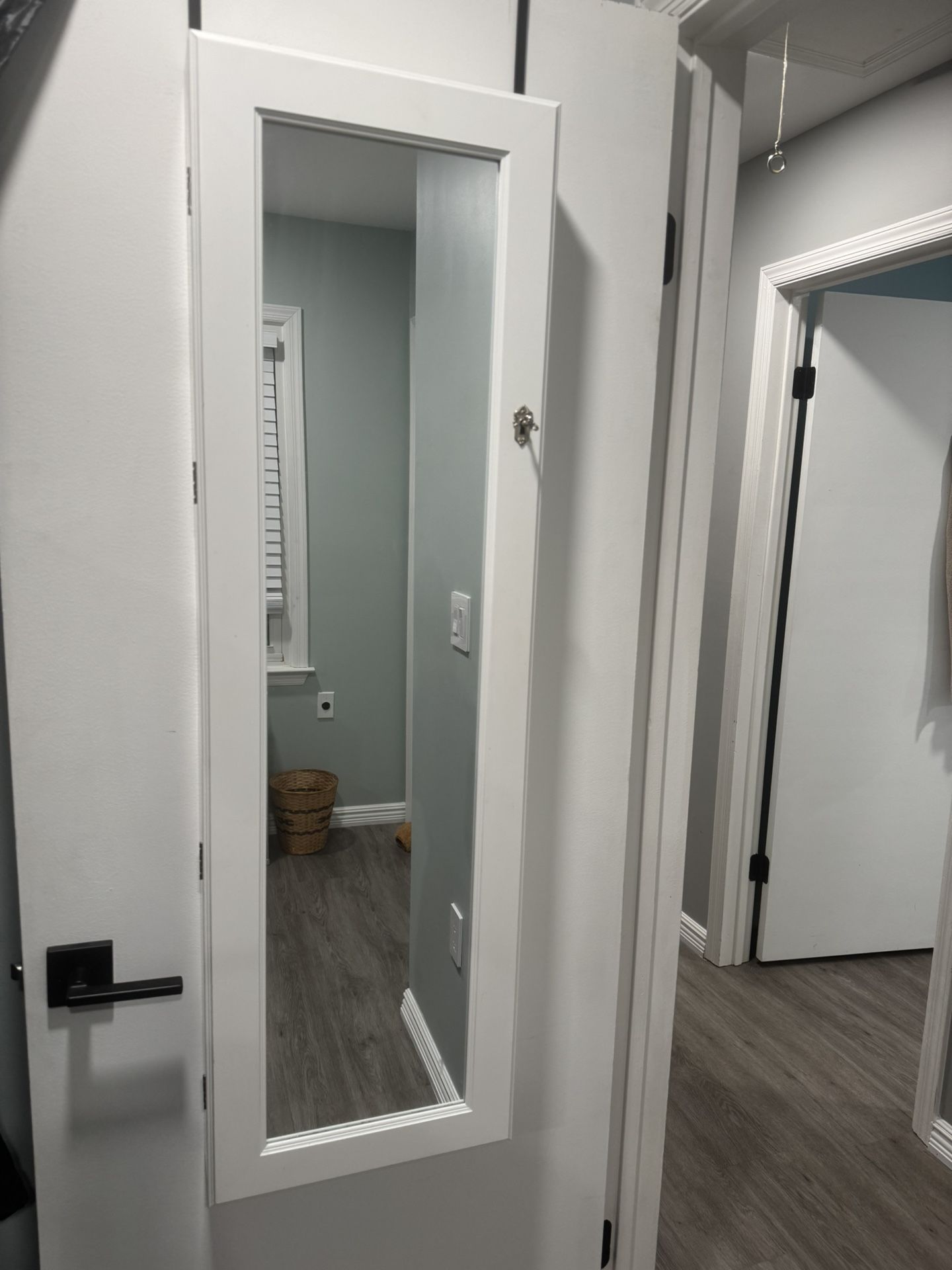 Barely used white jewelry holder with mirror. Hangs over the door. Or could be hung on wall with proper tools. Comes with a key that locks it. So much storage!!!!!