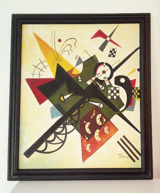 Height: 23" ( - Or 28 inches with frame). Length: 19" ( - Or 24" with frame). Condition: Excellent. Artist: Toon Lee. The frame is made of wood. Frame color: Black. And it's signed by the artist. This is an original painting reproduction of a famous painting by Vassily Kandinsky, titled: On White II.
