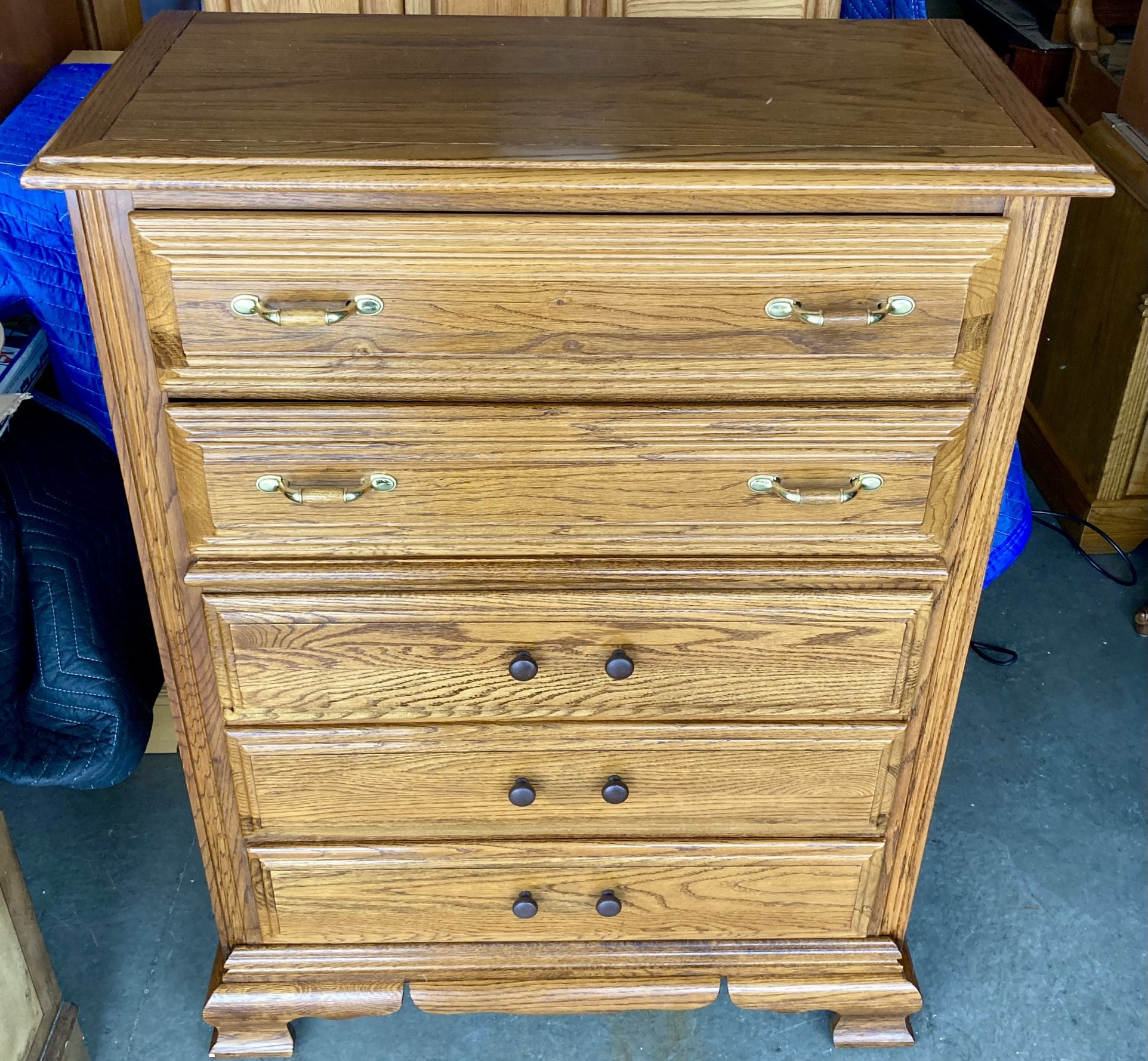Solid Wood Oak 5 Drawer Highboy Dresser Chest by Young Hinkle, Charter Oak collection. Overall in very good to excellent used condition. Tallboy measures 36” x 18” x 47” tall. All drawers slide smoothly on Kenlin glides and have solid wood dovetail construction. Constructed in the USA with solid oak wood with an Early American design. Oak finish has very minimal typical wear, overall is in great shape and has been enhanced with Beeswax and Citrus oil. $275 for this very nice, clean, solid and sturdy storage chest of drawers. Pick up in Lakeville. We also have some Oak nightstands / bedside end tables that would go well with this chest of drawers.