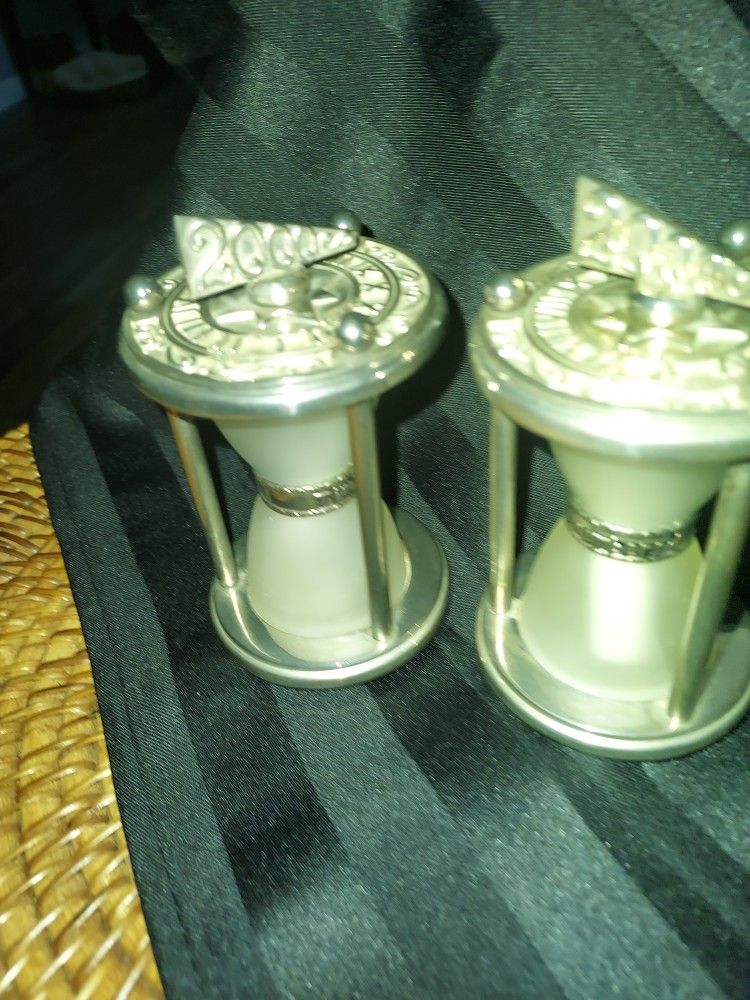 Marked on bottom "Lenox" Silver plated "Remember time" written on waist of each hour glass. Silver metal w frosted glass. Hour glass top twists off that reveal parchment w special message. 4.25"×2.25"