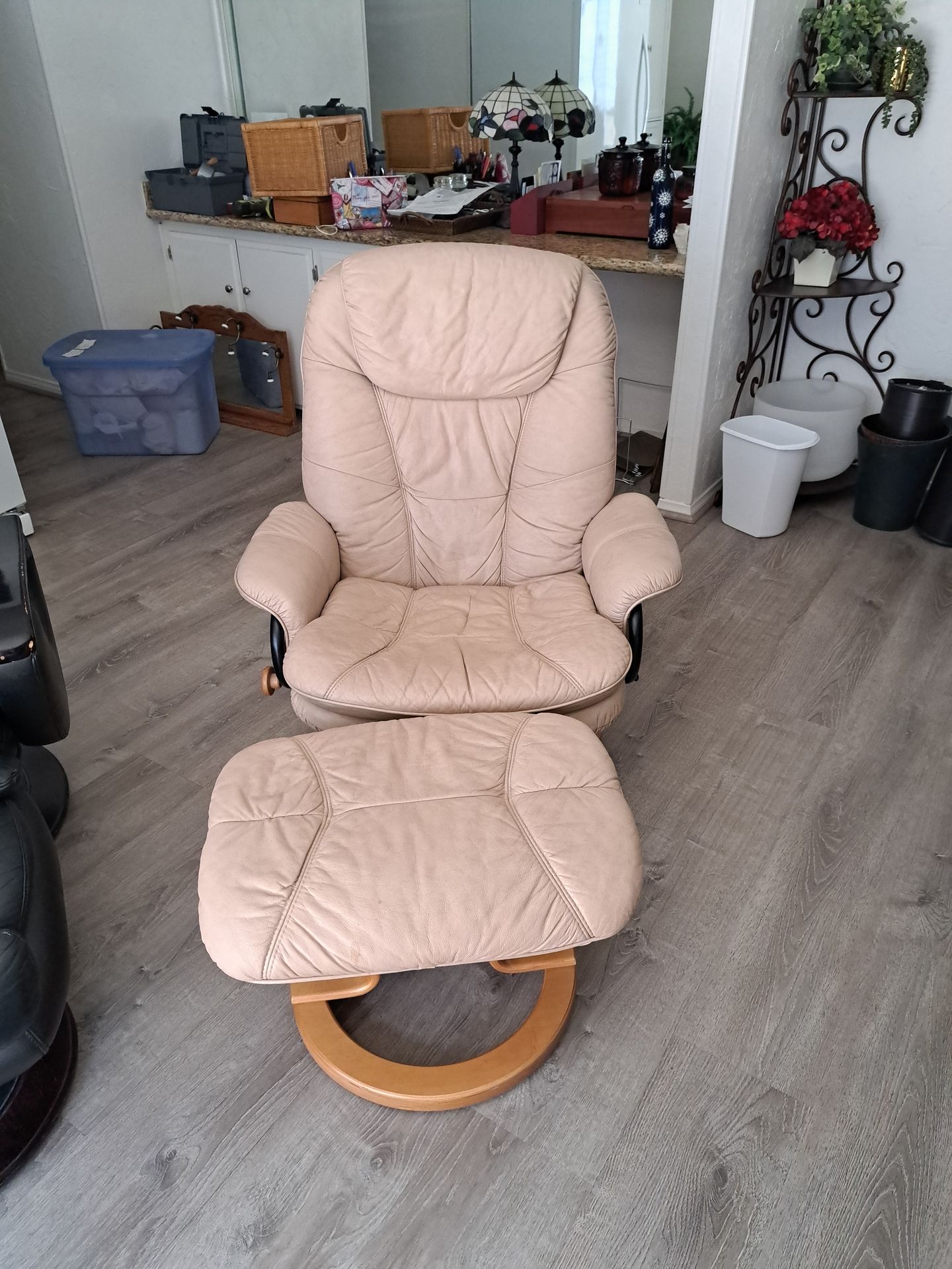 Tan faux leather recliner with ottoman