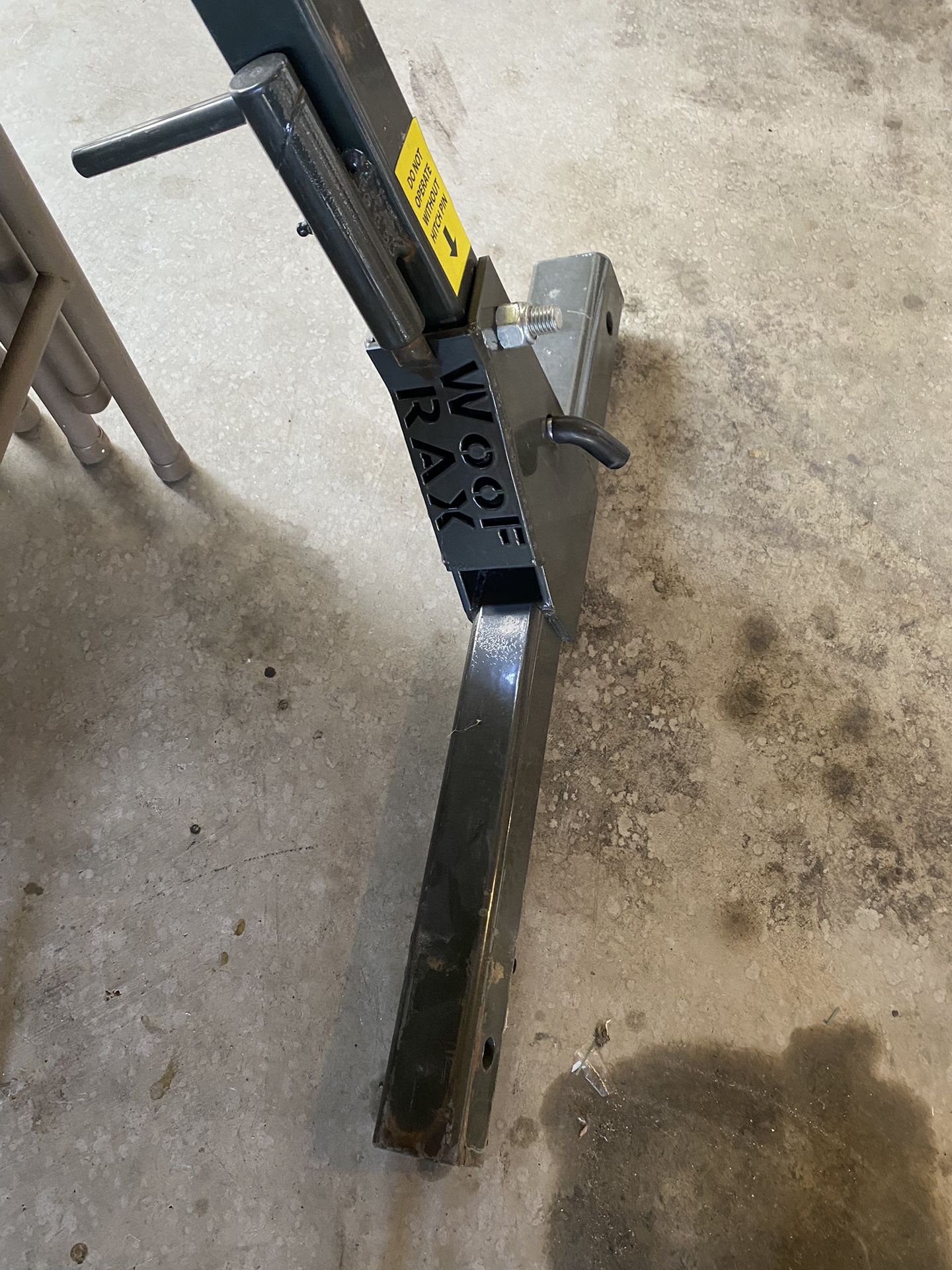 2 inch receiver, 2 inch adapter/extension. holds up to 6 bikes comes with straps, held by handle bars and rear tire made by Woof Rax