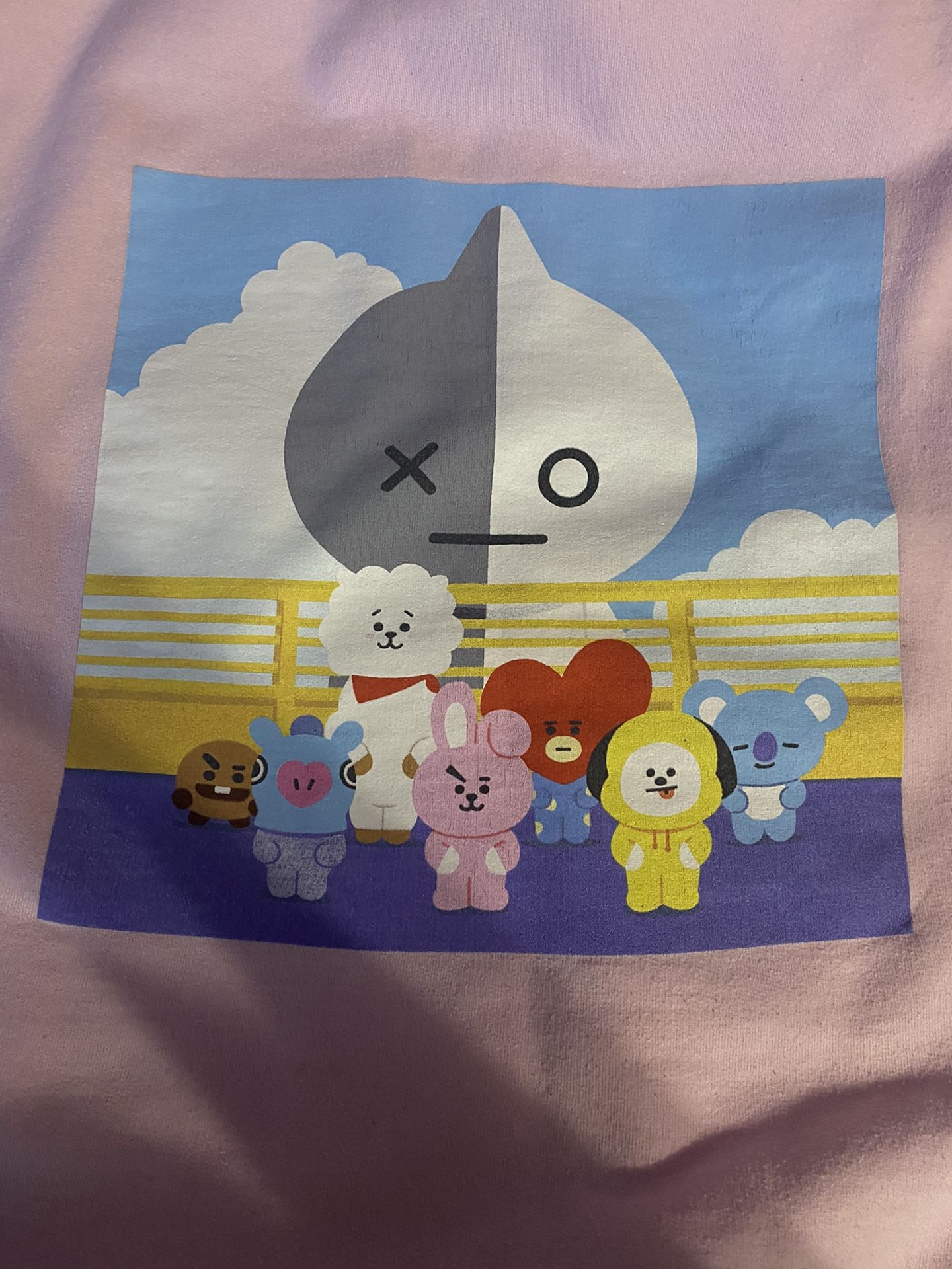 The BT21 Hoodie has been used a few times. It is medium sized. It’s bright pink and it has the BT21 characters on the back of the hoodie.