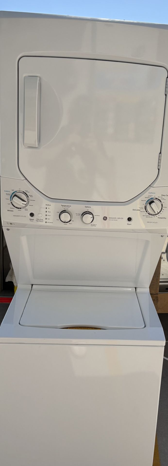 Brand new never used GE washer and dryer stackable. This unit was unboxed, but was never used. Retails for We $1300.