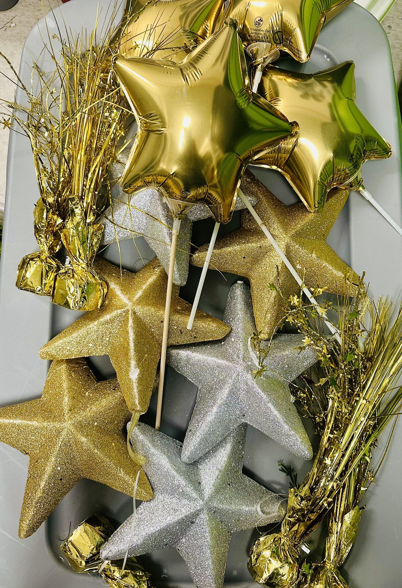 6 Big Styrofoam Stars, 4 Mylar Stars, 5 Balloon Weights