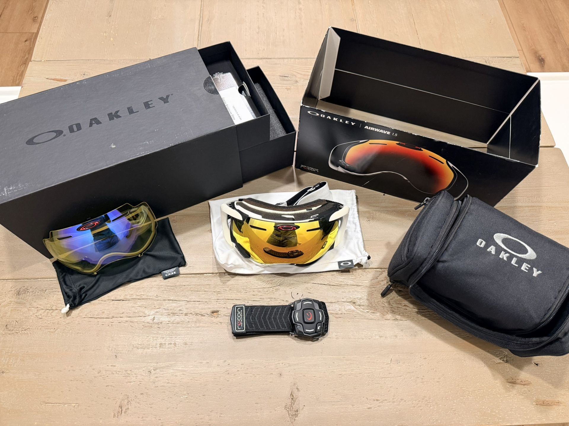 These were the flagship $650 goggles that have GPS, music, etc. on a HUD screen. The app is discontinued but people have replaced the battery and found ways to still run the software. Regardless, the goggles are amazing by themselves. Comes with two lenses. Great condition with all packaging and receipt. Own a piece of history! If you’re tech savvy, they’re still sought after. If you want Oakley goggles without the current price tag, these still work great without the HUD.