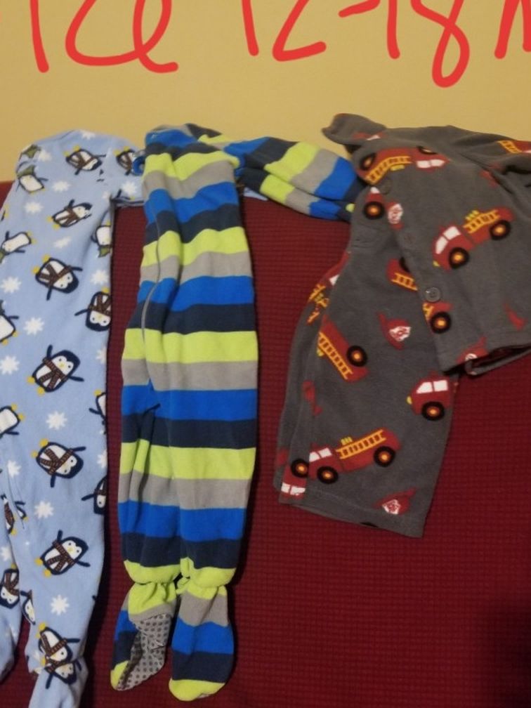 Winter, cotton and fleece pajamas for toddler, seven pairs: five one piece foot pajamas and two sets of tops/bottoms, size 12-18 months and in EUC