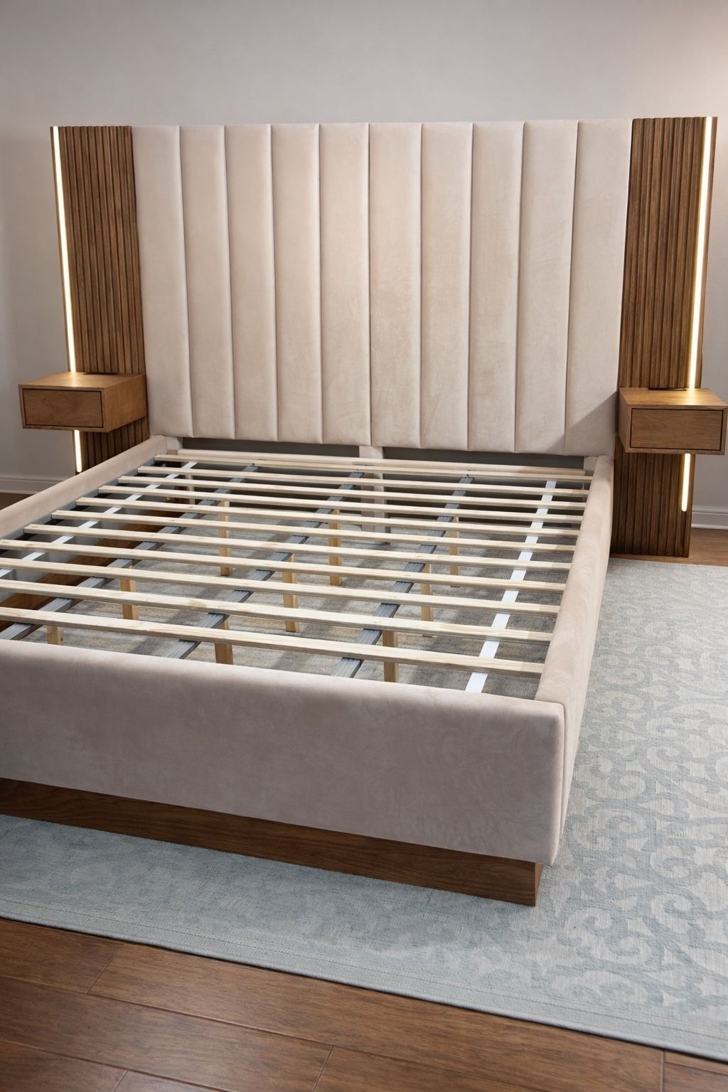 The Luxury Velour King Bed upholstered bed frame by AkmaBed is designed to bring comfort, durability, and a clean Contemporary look to your bedroom. This bed features a padded headboard, upholstered finish, and a strong support structure designed for everyday use. https://offerup.co/faYXKzQFnY?$deeplink_path=/redirect/ This model is available in King size and can be ordered in Velour in beige. It is a great option for customers looking for a stylish and functional bed frame for a modern home. Key Features • Upholstered bed frame • Contemporary design • Padded headboard • Available in size King • Suitable for standard mattress sizes • Led light + sensor Upholstered in Velour • Color: Beige • Frame material: Wood, plywood, metal Dimensions & Specifications Headboard height: 70 inches Mattress platform height: 14" Total bed width: 112" (16" side panels + 80" mattress area + 16" side panels) Overall bed size: 86" L × 112" W Headboard includes integrated wooden panels with floating nightstands (16" each side) All dimensions are approximate and may vary slightly depending on customization What’s Included • Bed frame • Headboard Floating Nightstands & LED lighting Not Included • Mattress • Bedding accessories Delivery is currently available within COLUMBUS, OHIO and surrounding areas.