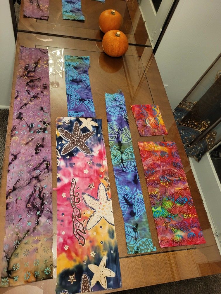 Previously cut but never used! Pick and choose what you want from each of my posts and I'll put it together for you!! 20$ OBO!!! (Starfish pattern is not Batik, but the rest are) Purple& green w/ blue leaves(2) 18"×6" 32"×4" Pink w/ rainbow abstract pattern(2) 19"×8" 8"×7" Tie dye starfish 29"×9" Purple w/ multicolor flowers 45"×7"