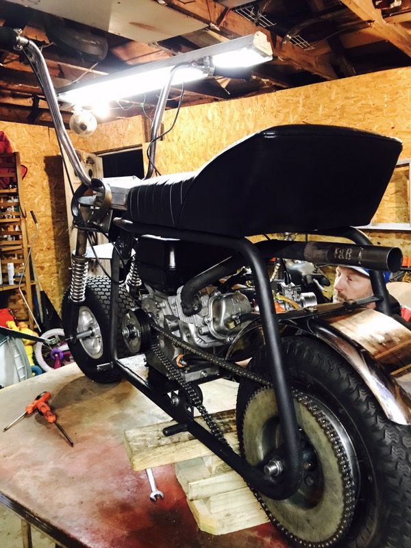 Ruttman pak mule Brand new seat Astro wheels Springer front end Big ruttman handle bar block Original chrome front and rear fenders F&b pipe Motor has +20 over rod Arc flywheel 274 cam Ported and polished head 28.5 valves milled .50 thousands 37lbs springs billet keepers and retained bronze guides Billet 1.3 rockers with billet guide plate 24mm carb with velocity stack Might trade for Harrison let me know what u got I'll give u my number so u can send pics