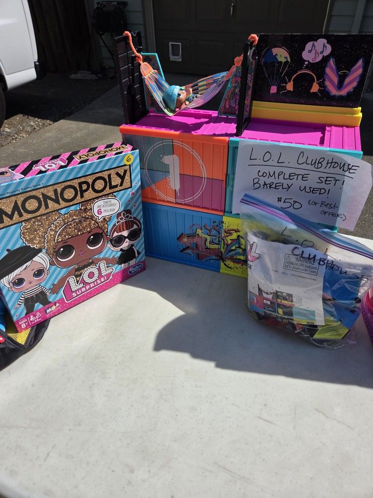 2020 LOL Surprise Doll Clubhouse Playset and LOL Monopoly game! Has all pieces, barely played with! Also comes with the 2 dolls! Everything works! Non-smoking and always kept indoors. $40