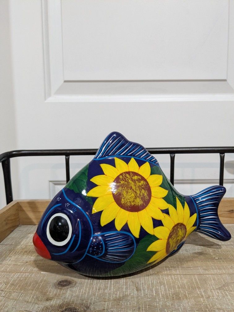 Glazed Mexican sunflower fish coin bank measures approx 10 X7, no holds and fcfs, pick up in nipomo or AG. Cash or Venmo