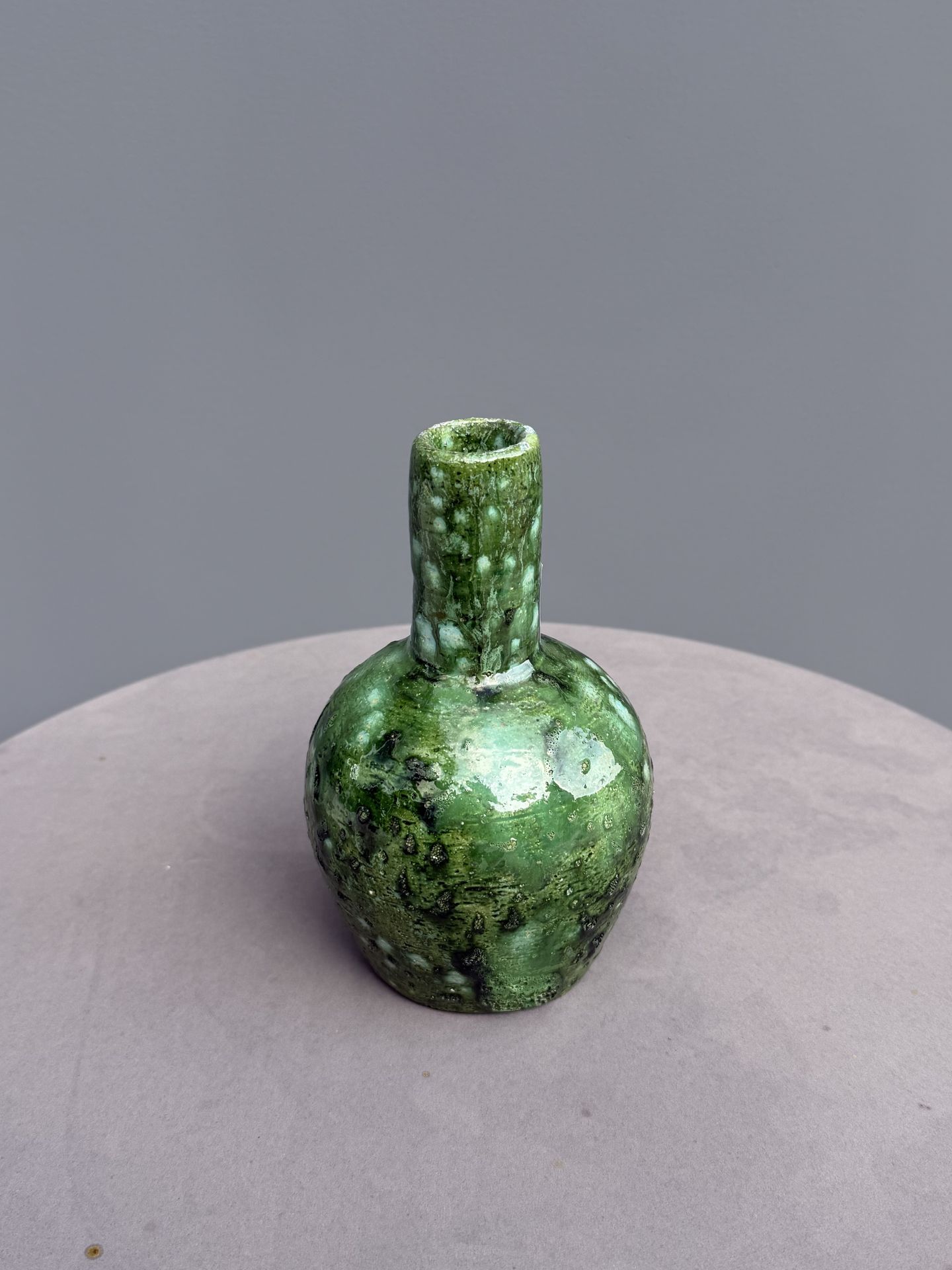 Small studio pottery bud vase with a rich mottled green glaze and organic texture. The rounded body and short neck give it a handmade, earthy look that fits perfectly with mid-century, rustic, or modern décor styles. Ideal for a single stem or as a shelf accent.
