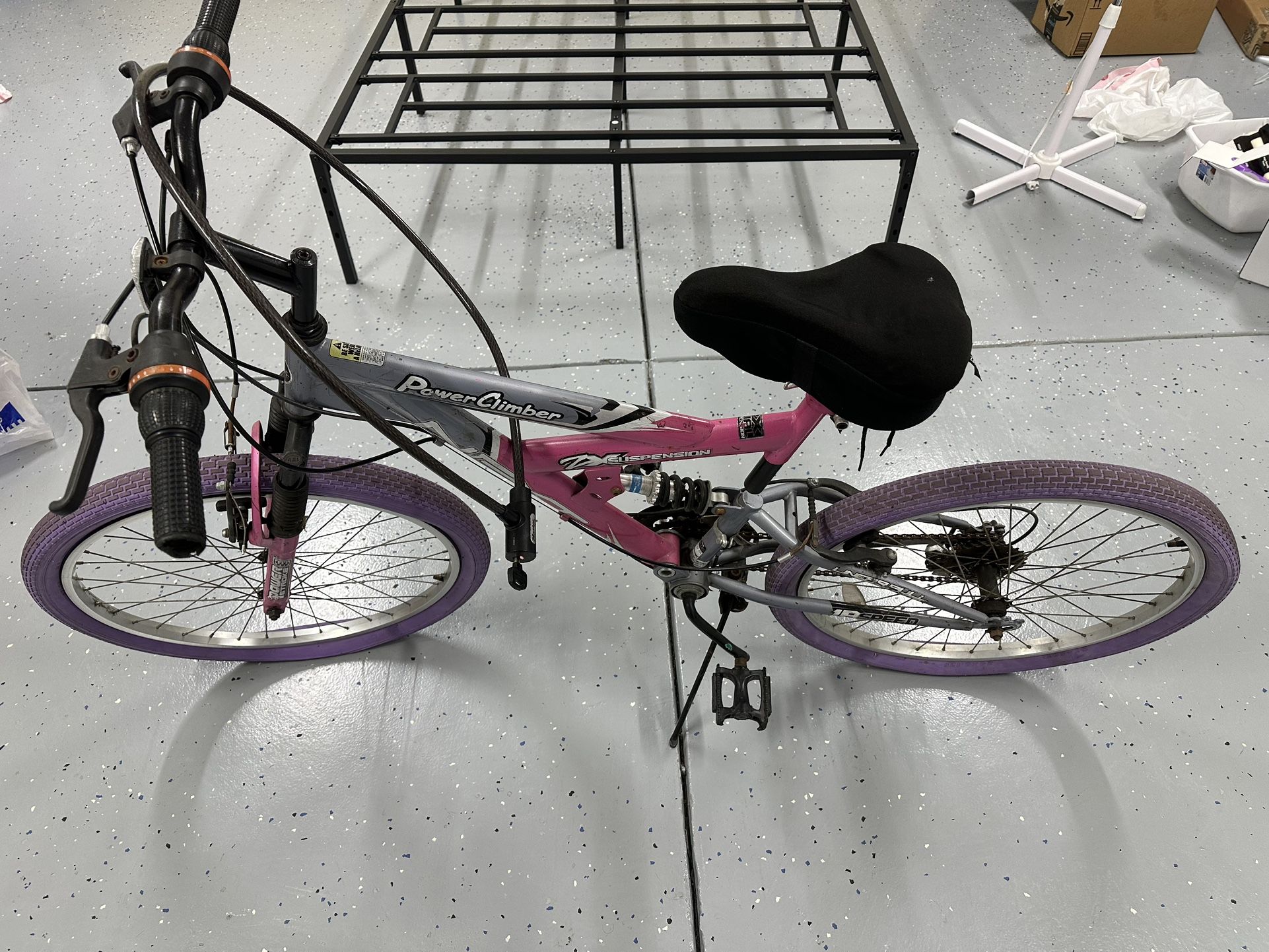 Free bike lock. Next Power Climber bike is typically a dual-suspension bike, meaning it has shocks on both the front and rear wheels. It often features an 18-speed gear system with a Shimano derailleur. The bike is equipped with front and rear V-brakes. It has knobby tires for better traction on various terrains and alloy rims for durability