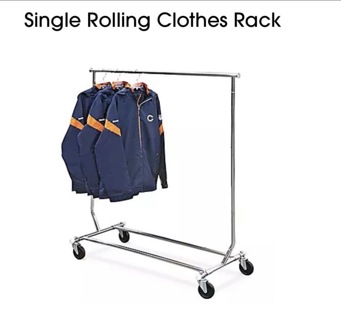 Single Rolling Clothes Rack with Casters do not lock. ✔️Used item Please review the photos. ✔️ Pick up location is off I-20/McCart Ave Fort Worth, TX 76133 Set up fast for winter coats and easily collapse for summer storage. 48" hangrail expands with two 12" pullout rods. Adjustable height for longer garments. Holds double the amount of garments. Casters do not lock. DIMENSIONS: • Adjustable Height Range: 55 - 65" with 4 ½" increments Depth: 22 1½" Hang Rail (Diameter): 1" Casters: 4" Collapsed: 42.5 x 21.6×4.2" MATERIAL: 16 gauge Chrome-plated steel Casters: Hard Rubber STYLE: • Casters do not lock.