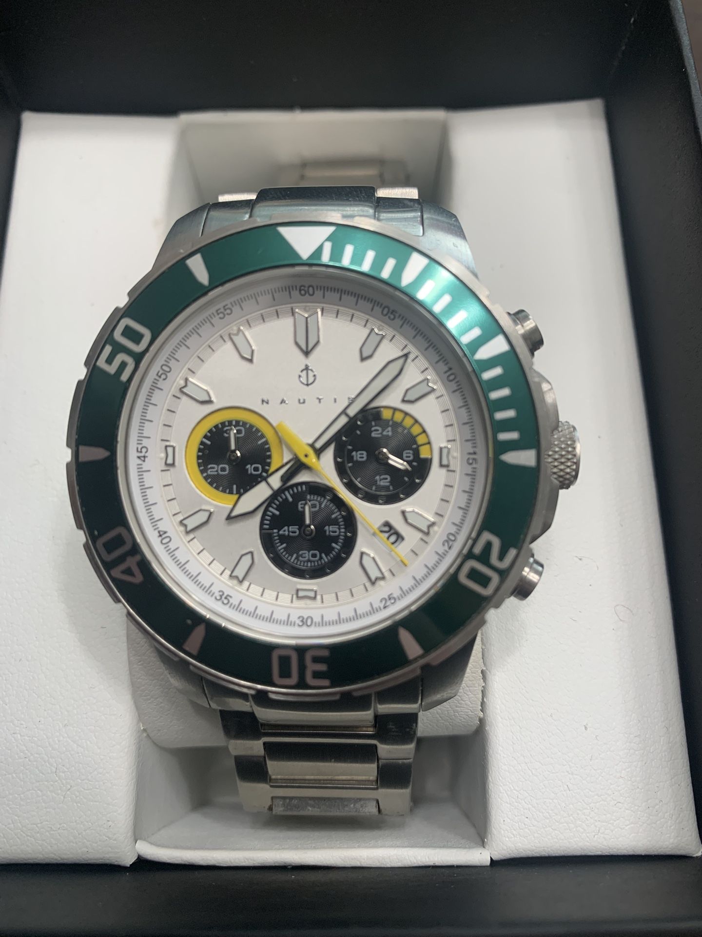 Nautis quartz chronograph dive-style watch featuring a stainless steel case and bracelet, green rotating bezel, and white dial with three sub-dials. Chronograph functions include 60-minute counter, running seconds, and 24-hour indicator. Screw-down crown and pushers, solid build with a sporty diver aesthetic. Comes with original Nautis presentation box. Bracelet shows light wear consistent with normal use. Crystal and bezel are clean. Watch is running properly at time of listing.