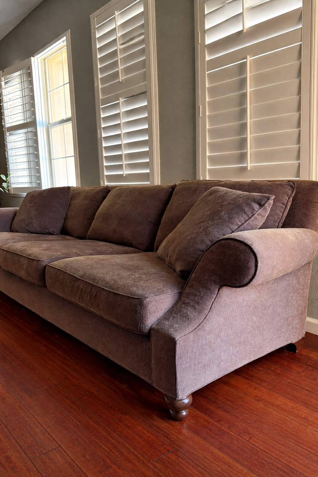 Very well kept, beautiful sofa. Deep cushions, comfortable to sit on with a brown corduroy fabric. Color is chocolate brown. This couch is no longer in production and can not be purchased new. You won’t find another like it. Pick up in Mission Hills. Length: 8ft Depth: 3.5ft Height of back: 34n Height of cushions: 20in