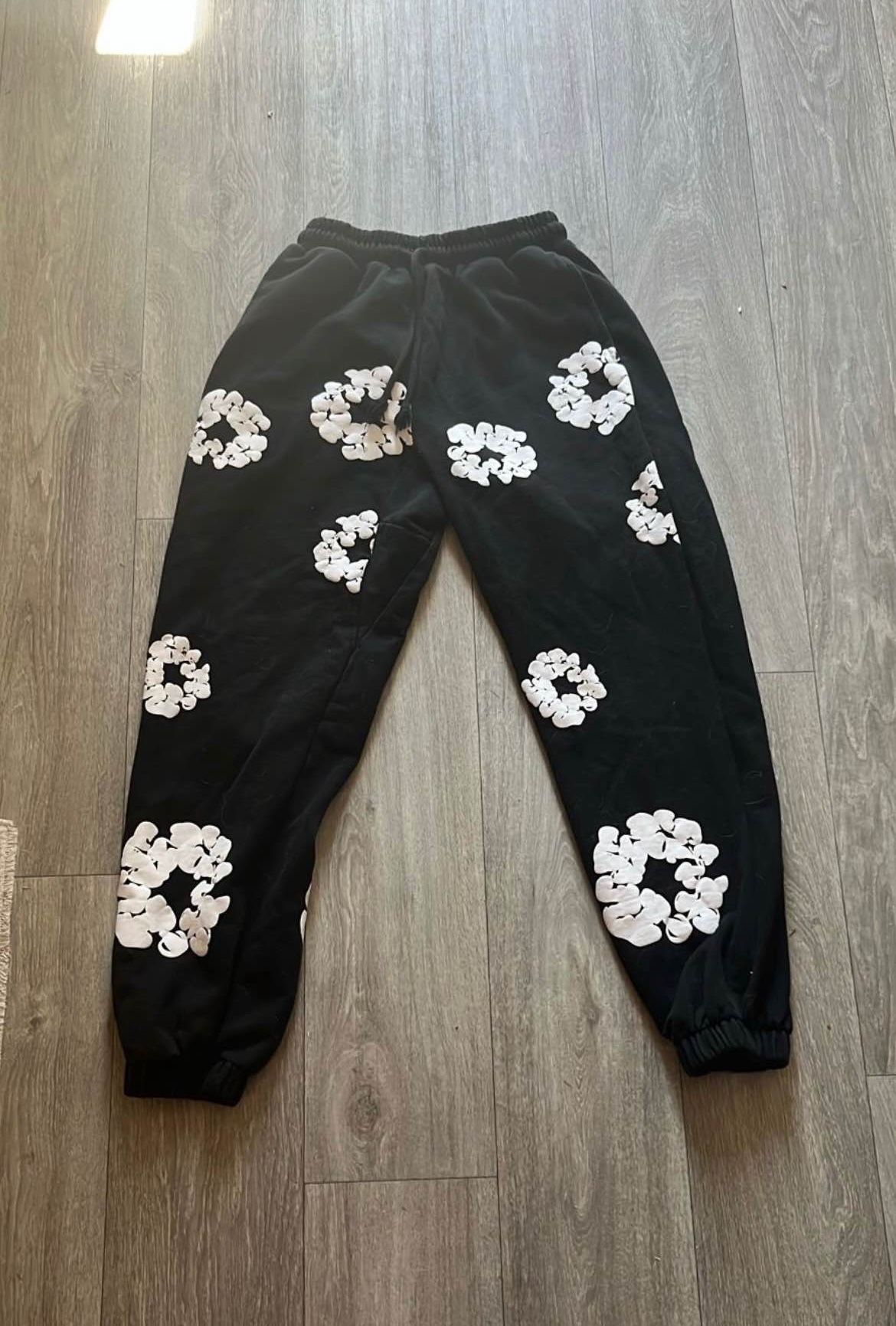 Black Denim Tears–inspired sweatpants featuring the signature cotton wreath print throughout. Comfortable fit with elastic waistband and cuffed ankles. Great condition and perfect for streetwear fits. Message for more info.